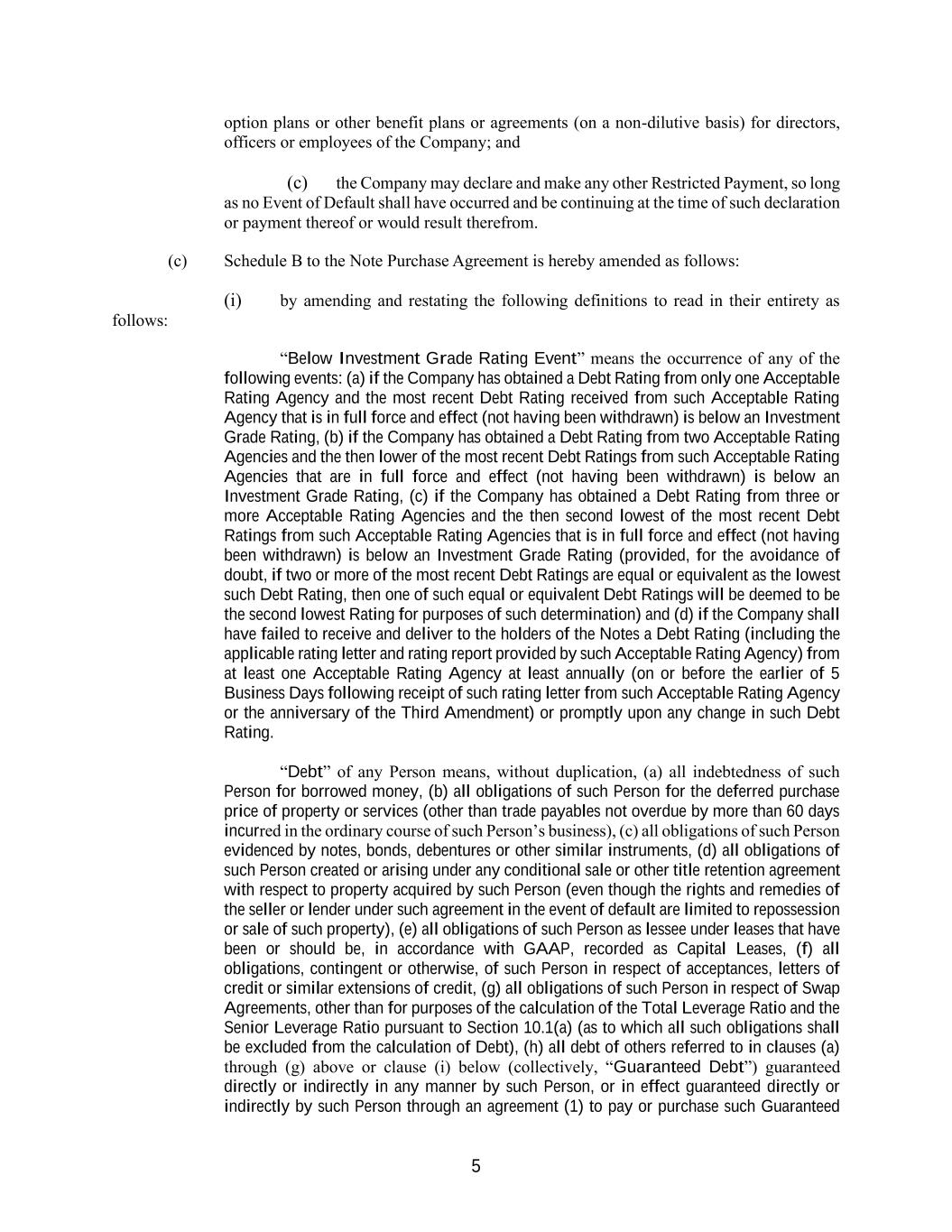 5 option plans or other benefit plans or agreements (on a non-dilutive basis) for directors, officers or employees of the Company; and (c) the Company may declare and make any other Restricted Payment, so long as no Event of Default shall have occurred and be continuing at the time of such declaration or payment thereof or would result therefrom. (c) Schedule B to the Note Purchase Agreement is hereby amended as follows: (i) by amending and restating the following definitions to read in their entirety as follows: “Below Investment Grade Rating Event” means the occurrence of any of the following events: (a) if the Company has obtained a Debt Rating from only one Acceptable Rating Agency and the most recent Debt Rating received from such Acceptable Rating Agency that is in full force and effect (not having been withdrawn) is below an Investment Grade Rating, (b) if the Company has obtained a Debt Rating from two Acceptable Rating Agencies and the then lower of the most recent Debt Ratings from such Acceptable Rating Agencies that are in full force and effect (not having been withdrawn) is below an Investment Grade Rating, (c) if the Company has obtained a Debt Rating from three or more Acceptable Rating Agencies and the then second lowest of the most recent Debt Ratings from such Acceptable Rating Agencies that is in full force and effect (not having been withdrawn) is below an Investment Grade Rating (provided, for the avoidance of doubt, if two or more of the most recent Debt Ratings are equal or equivalent as the lowest such Debt Rating, then one of such equal or equivalent Debt Ratings will be deemed to be the second lowest Rating for purposes of such determination) and (d) if the Company shall have failed to receive and deliver to the holders of the Notes a Debt Rating (including the applicable rating letter and rating report provided by such Acceptable Rating Agency) from at least one Acceptable Rating Agency at least annually (on or before the earlier of 5 Business Days following receipt of such rating letter from such Acceptable Rating Agency or the anniversary of the Third Amendment) or promptly upon any change in such Debt Rating. “Debt” of any Person means, without duplication, (a) all indebtedness of such Person for borrowed money, (b) all obligations of such Person for the deferred purchase price of property or services (other than trade payables not overdue by more than 60 days incurred in the ordinary course of such Person’s business), (c) all obligations of such Person evidenced by notes, bonds, debentures or other similar instruments, (d) all obligations of such Person created or arising under any conditional sale or other title retention agreement with respect to property acquired by such Person (even though the rights and remedies of the seller or lender under such agreement in the event of default are limited to repossession or sale of such property), (e) all obligations of such Person as lessee under leases that have been or should be, in accordance with GAAP, recorded as Capital Leases, (f) all obligations, contingent or otherwise, of such Person in respect of acceptances, letters of credit or similar extensions of credit, (g) all obligations of such Person in respect of Swap Agreements, other than for purposes of the calculation of the Total Leverage Ratio and the Senior Leverage Ratio pursuant to Section 10.1(a) (as to which all such obligations shall be excluded from the calculation of Debt), (h) all debt of others referred to in clauses (a) through (g) above or clause (i) below (collectively, “Guaranteed Debt”) guaranteed directly or indirectly in any manner by such Person, or in effect guaranteed directly or indirectly by such Person through an agreement (1) to pay or purchase such Guaranteed