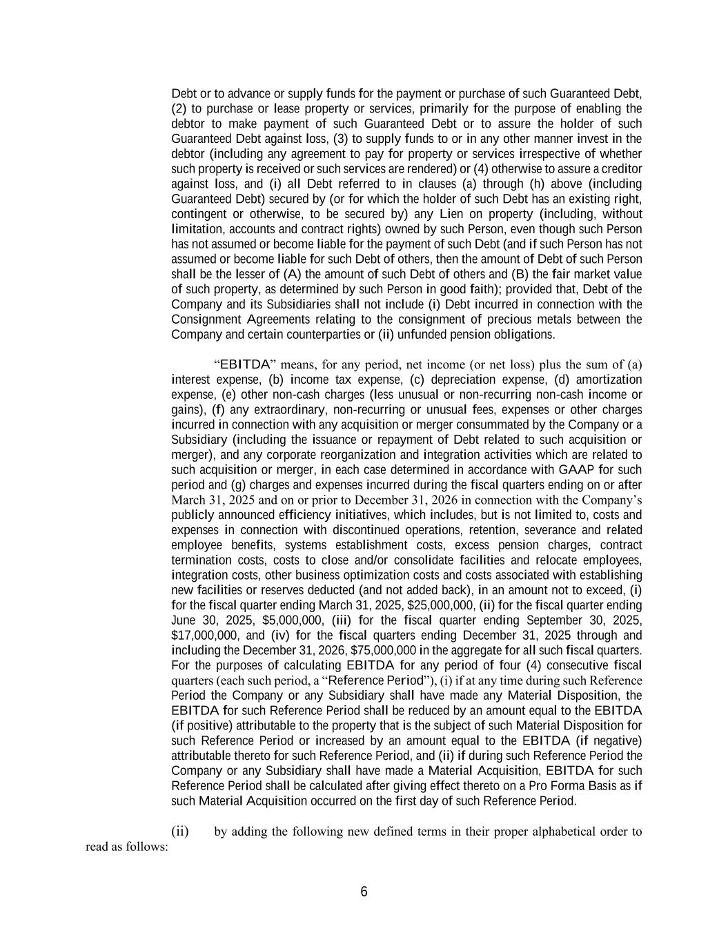 6 Debt or to advance or supply funds for the payment or purchase of such Guaranteed Debt, (2) to purchase or lease property or services, primarily for the purpose of enabling the debtor to make payment of such Guaranteed Debt or to assure the holder of such Guaranteed Debt against loss, (3) to supply funds to or in any other manner invest in the debtor (including any agreement to pay for property or services irrespective of whether such property is received or such services are rendered) or (4) otherwise to assure a creditor against loss, and (i) all Debt referred to in clauses (a) through (h) above (including Guaranteed Debt) secured by (or for which the holder of such Debt has an existing right, contingent or otherwise, to be secured by) any Lien on property (including, without limitation, accounts and contract rights) owned by such Person, even though such Person has not assumed or become liable for the payment of such Debt (and if such Person has not assumed or become liable for such Debt of others, then the amount of Debt of such Person shall be the lesser of (A) the amount of such Debt of others and (B) the fair market value of such property, as determined by such Person in good faith); provided that, Debt of the Company and its Subsidiaries shall not include (i) Debt incurred in connection with the Consignment Agreements relating to the consignment of precious metals between the Company and certain counterparties or (ii) unfunded pension obligations. “EBITDA” means, for any period, net income (or net loss) plus the sum of (a) interest expense, (b) income tax expense, (c) depreciation expense, (d) amortization expense, (e) other non-cash charges (less unusual or non-recurring non-cash income or gains), (f) any extraordinary, non-recurring or unusual fees, expenses or other charges incurred in connection with any acquisition or merger consummated by the Company or a Subsidiary (including the issuance or repayment of Debt related to such acquisition or merger), and any corporate reorganization and integration activities which are related to such acquisition or merger, in each case determined in accordance with GAAP for such period and (g) charges and expenses incurred during the fiscal quarters ending on or after March 31, 2025 and on or prior to December 31, 2026 in connection with the Company’s publicly announced efficiency initiatives, which includes, but is not limited to, costs and expenses in connection with discontinued operations, retention, severance and related employee benefits, systems establishment costs, excess pension charges, contract termination costs, costs to close and/or consolidate facilities and relocate employees, integration costs, other business optimization costs and costs associated with establishing new facilities or reserves deducted (and not added back), in an amount not to exceed, (i) for the fiscal quarter ending March 31, 2025, $25,000,000, (ii) for the fiscal quarter ending June 30, 2025, $5,000,000, (iii) for the fiscal quarter ending September 30, 2025, $17,000,000, and (iv) for the fiscal quarters ending December 31, 2025 through and including the December 31, 2026, $75,000,000 in the aggregate for all such fiscal quarters. For the purposes of calculating EBITDA for any period of four (4) consecutive fiscal quarters (each such period, a “Reference Period”), (i) if at any time during such Reference Period the Company or any Subsidiary shall have made any Material Disposition, the EBITDA for such Reference Period shall be reduced by an amount equal to the EBITDA (if positive) attributable to the property that is the subject of such Material Disposition for such Reference Period or increased by an amount equal to the EBITDA (if negative) attributable thereto for such Reference Period, and (ii) if during such Reference Period the Company or any Subsidiary shall have made a Material Acquisition, EBITDA for such Reference Period shall be calculated after giving effect thereto on a Pro Forma Basis as if such Material Acquisition occurred on the first day of such Reference Period. (ii) by adding the following new defined terms in their proper alphabetical order to read as follows: