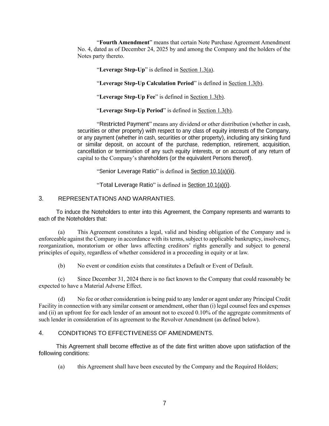 7 “Fourth Amendment” means that certain Note Purchase Agreement Amendment No. 4, dated as of December 24, 2025 by and among the Company and the holders of the Notes party thereto. “Leverage Step-Up” is defined in Section 1.3(a). “Leverage Step-Up Calculation Period” is defined in Section 1.3(b). “Leverage Step-Up Fee” is defined in Section 1.3(b). “Leverage Step-Up Period” is defined in Section 1.3(b). “Restricted Payment” means any dividend or other distribution (whether in cash, securities or other property) with respect to any class of equity interests of the Company, or any payment (whether in cash, securities or other property), including any sinking fund or similar deposit, on account of the purchase, redemption, retirement, acquisition, cancellation or termination of any such equity interests, or on account of any return of capital to the Company’s shareholders (or the equivalent Persons thereof). “Senior Leverage Ratio” is defined in Section 10.1(a)(ii). “Total Leverage Ratio” is defined in Section 10.1(a)(i). 3. REPRESENTATIONS AND WARRANTIES. To induce the Noteholders to enter into this Agreement, the Company represents and warrants to each of the Noteholders that: (a) This Agreement constitutes a legal, valid and binding obligation of the Company and is enforceable against the Company in accordance with its terms, subject to applicable bankruptcy, insolvency, reorganization, moratorium or other laws affecting creditors’ rights generally and subject to general principles of equity, regardless of whether considered in a proceeding in equity or at law. (b) No event or condition exists that constitutes a Default or Event of Default. (c) Since December 31, 2024 there is no fact known to the Company that could reasonably be expected to have a Material Adverse Effect. (d) No fee or other consideration is being paid to any lender or agent under any Principal Credit Facility in connection with any similar consent or amendment, other than (i) legal counsel fees and expenses and (ii) an upfront fee for each lender of an amount not to exceed 0.10% of the aggregate commitments of such lender in consideration of its agreement to the Revolver Amendment (as defined below). 4. CONDITIONS TO EFFECTIVENESS OF AMENDMENTS. This Agreement shall become effective as of the date first written above upon satisfaction of the following conditions: (a) this Agreement shall have been executed by the Company and the Required Holders;