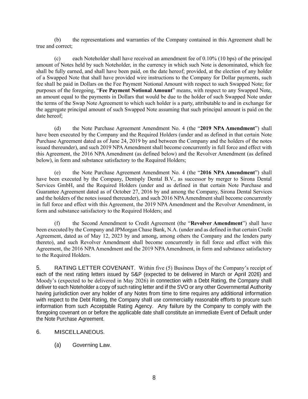 8 (b) the representations and warranties of the Company contained in this Agreement shall be true and correct; (c) each Noteholder shall have received an amendment fee of 0.10% (10 bps) of the principal amount of Notes held by such Noteholder, in the currency in which such Note is denominated, which fee shall be fully earned, and shall have been paid, on the date hereof; provided, at the election of any holder of a Swapped Note that shall have provided wire instructions to the Company for Dollar payments, such fee shall be paid in Dollars on the Fee Payment Notional Amount with respect to such Swapped Note; for purposes of the foregoing, “Fee Payment Notional Amount” means, with respect to any Swapped Note, an amount equal to the payments in Dollars that would be due to the holder of such Swapped Note under the terms of the Swap Note Agreement to which such holder is a party, attributable to and in exchange for the aggregate principal amount of such Swapped Note assuming that such principal amount is paid on the date hereof; (d) the Note Purchase Agreement Amendment No. 4 (the “2019 NPA Amendment”) shall have been executed by the Company and the Required Holders (under and as defined in that certain Note Purchase Agreement dated as of June 24, 2019 by and between the Company and the holders of the notes issued thereunder), and such 2019 NPA Amendment shall become concurrently in full force and effect with this Agreement, the 2016 NPA Amendment (as defined below) and the Revolver Amendment (as defined below), in form and substance satisfactory to the Required Holders; (e) the Note Purchase Agreement Amendment No. 4 (the “2016 NPA Amendment”) shall have been executed by the Company, Dentsply Dental B.V., as successor by merger to Sirona Dental Services GmbH, and the Required Holders (under and as defined in that certain Note Purchase and Guarantee Agreement dated as of October 27, 2016 by and among the Company, Sirona Dental Services and the holders of the notes issued thereunder), and such 2016 NPA Amendment shall become concurrently in full force and effect with this Agreement, the 2019 NPA Amendment and the Revolver Amendment, in form and substance satisfactory to the Required Holders; and (f) the Second Amendment to Credit Agreement (the “Revolver Amendment”) shall have been executed by the Company and JPMorgan Chase Bank, N.A. (under and as defined in that certain Credit Agreement, dated as of May 12, 2023 by and among, among others the Company and the lenders party thereto), and such Revolver Amendment shall become concurrently in full force and effect with this Agreement, the 2016 NPA Amendment and the 2019 NPA Amendment, in form and substance satisfactory to the Required Holders. 5. RATING LETTER COVENANT. Within five (5) Business Days of the Company’s receipt of each of the next rating letters issued by S&P (expected to be delivered in March or April 2026) and Moody’s (expected to be delivered in May 2026) in connection with a Debt Rating, the Company shall deliver to each Noteholder a copy of such rating letter and if the SVO or any other Governmental Authority having jurisdiction over any holder of any Notes from time to time requires any additional information with respect to the Debt Rating, the Company shall use commercially reasonable efforts to procure such information from such Acceptable Rating Agency. Any failure by the Company to comply with the foregoing covenant on or before the applicable date shall constitute an immediate Event of Default under the Note Purchase Agreement. 6. MISCELLANEOUS. (a) Governing Law.