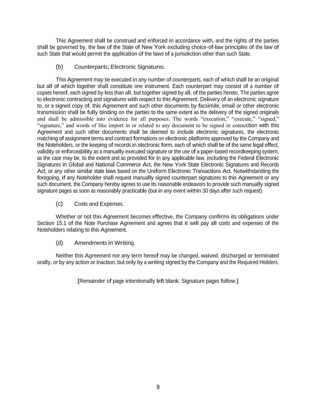 9 This Agreement shall be construed and enforced in accordance with, and the rights of the parties shall be governed by, the law of the State of New York excluding choice-of-law principles of the law of such State that would permit the application of the laws of a jurisdiction other than such State. (b) Counterparts; Electronic Signatures. This Agreement may be executed in any number of counterparts, each of which shall be an original but all of which together shall constitute one instrument. Each counterpart may consist of a number of copies hereof, each signed by less than all, but together signed by all, of the parties hereto. The parties agree to electronic contracting and signatures with respect to this Agreement. Delivery of an electronic signature to, or a signed copy of, this Agreement and such other documents by facsimile, email or other electronic transmission shall be fully binding on the parties to the same extent as the delivery of the signed originals and shall be admissible into evidence for all purposes. The words “execution,” “execute,” “signed,” “signature,” and words of like import in or related to any document to be signed in connection with this Agreement and such other documents shall be deemed to include electronic signatures, the electronic matching of assignment terms and contract formations on electronic platforms approved by the Company and the Noteholders, or the keeping of records in electronic form, each of which shall be of the same legal effect, validity or enforceability as a manually executed signature or the use of a paper-based recordkeeping system, as the case may be, to the extent and as provided for in any applicable law, including the Federal Electronic Signatures in Global and National Commerce Act, the New York State Electronic Signatures and Records Act, or any other similar state laws based on the Uniform Electronic Transactions Act. Notwithstanding the foregoing, if any Noteholder shall request manually signed counterpart signatures to this Agreement or any such document, the Company hereby agrees to use its reasonable endeavors to provide such manually signed signature pages as soon as reasonably practicable (but in any event within 30 days after such request). (c) Costs and Expenses. Whether or not this Agreement becomes effective, the Company confirms its obligations under Section 15.1 of the Note Purchase Agreement and agrees that it will pay all costs and expenses of the Noteholders relating to this Agreement. (d) Amendments in Writing. Neither this Agreement nor any term hereof may be changed, waived, discharged or terminated orally, or by any action or inaction, but only by a writing signed by the Company and the Required Holders. [Remainder of page intentionally left blank. Signature pages follow.]
