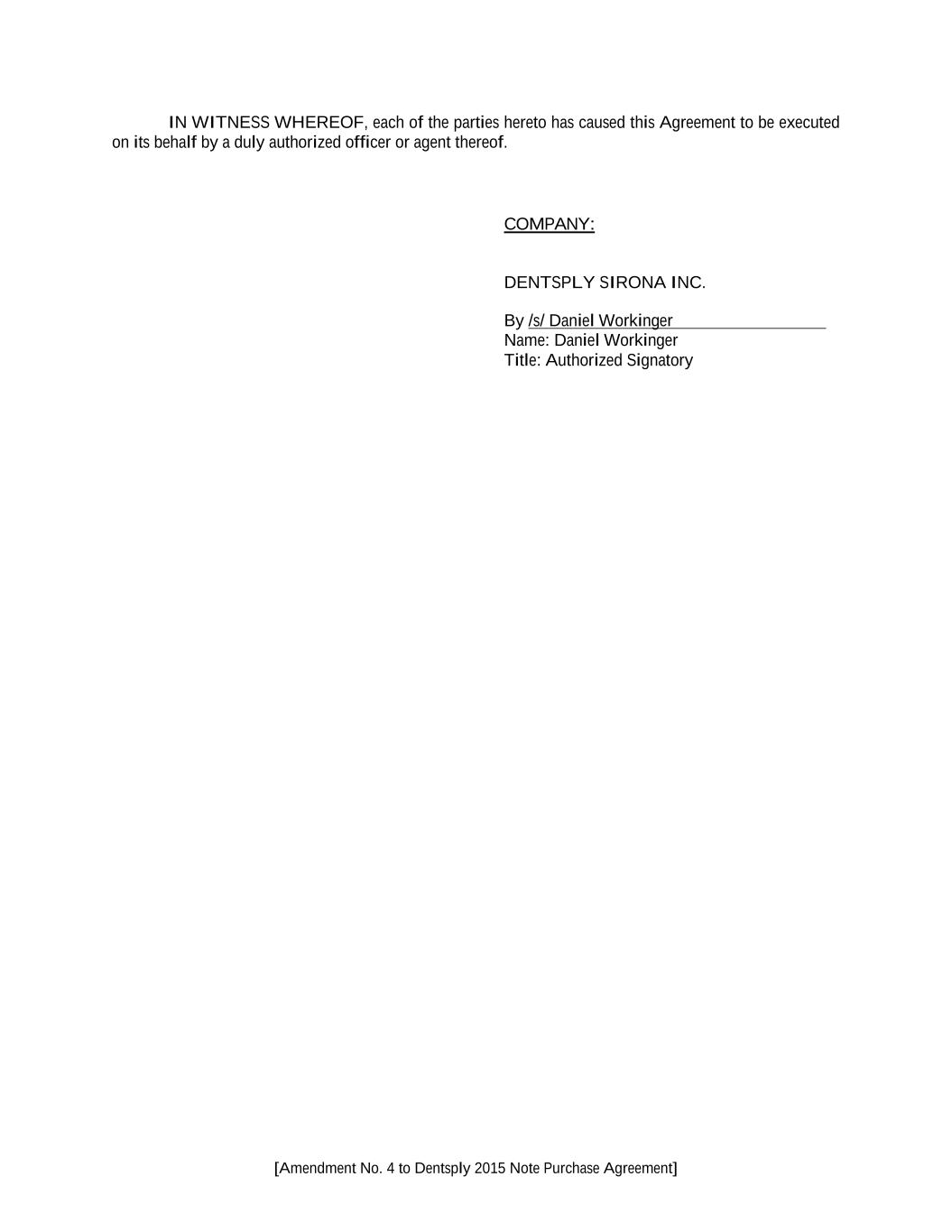 [Amendment No. 4 to Dentsply 2015 Note Purchase Agreement] IN WITNESS WHEREOF, each of the parties hereto has caused this Agreement to be executed on its behalf by a duly authorized officer or agent thereof. COMPANY: DENTSPLY SIRONA INC. By /s/ Daniel Workinger Name: Daniel Workinger Title: Authorized Signatory