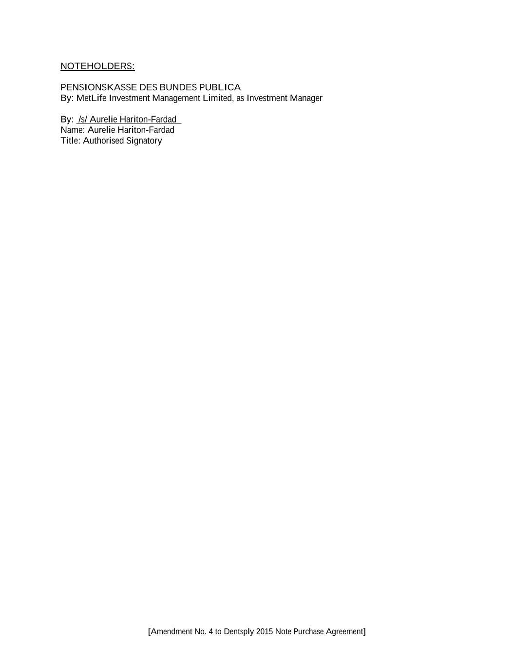 [Amendment No. 4 to Dentsply 2015 Note Purchase Agreement] NOTEHOLDERS: PENSIONSKASSE DES BUNDES PUBLICA By: MetLife Investment Management Limited, as Investment Manager By: /s/ Aurelie Hariton-Fardad Name: Aurelie Hariton-Fardad Title: Authorised Signatory