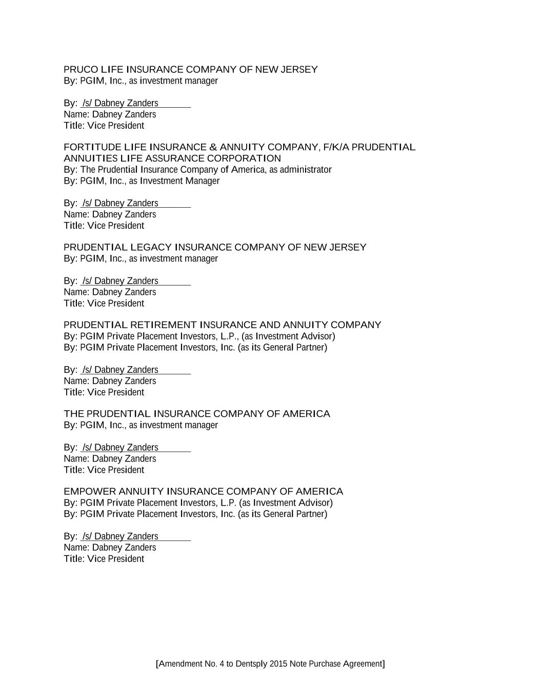 [Amendment No. 4 to Dentsply 2015 Note Purchase Agreement] PRUCO LIFE INSURANCE COMPANY OF NEW JERSEY By: PGIM, Inc., as investment manager By: /s/ Dabney Zanders Name: Dabney Zanders Title: Vice President FORTITUDE LIFE INSURANCE & ANNUITY COMPANY, F/K/A PRUDENTIAL ANNUITIES LIFE ASSURANCE CORPORATION By: The Prudential Insurance Company of America, as administrator By: PGIM, Inc., as Investment Manager By: /s/ Dabney Zanders Name: Dabney Zanders Title: Vice President PRUDENTIAL LEGACY INSURANCE COMPANY OF NEW JERSEY By: PGIM, Inc., as investment manager By: /s/ Dabney Zanders Name: Dabney Zanders Title: Vice President PRUDENTIAL RETIREMENT INSURANCE AND ANNUITY COMPANY By: PGIM Private Placement Investors, L.P., (as Investment Advisor) By: PGIM Private Placement Investors, Inc. (as its General Partner) By: /s/ Dabney Zanders Name: Dabney Zanders Title: Vice President THE PRUDENTIAL INSURANCE COMPANY OF AMERICA By: PGIM, Inc., as investment manager By: /s/ Dabney Zanders Name: Dabney Zanders Title: Vice President EMPOWER ANNUITY INSURANCE COMPANY OF AMERICA By: PGIM Private Placement Investors, L.P. (as Investment Advisor) By: PGIM Private Placement Investors, Inc. (as its General Partner) By: /s/ Dabney Zanders Name: Dabney Zanders Title: Vice President