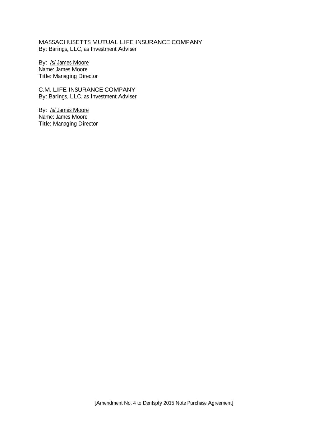 [Amendment No. 4 to Dentsply 2015 Note Purchase Agreement] MASSACHUSETTS MUTUAL LIFE INSURANCE COMPANY By: Barings, LLC, as Investment Adviser By: /s/ James Moore Name: James Moore Title: Managing Director C.M. LIFE INSURANCE COMPANY By: Barings, LLC, as Investment Adviser By: /s/ James Moore Name: James Moore Title: Managing Director
