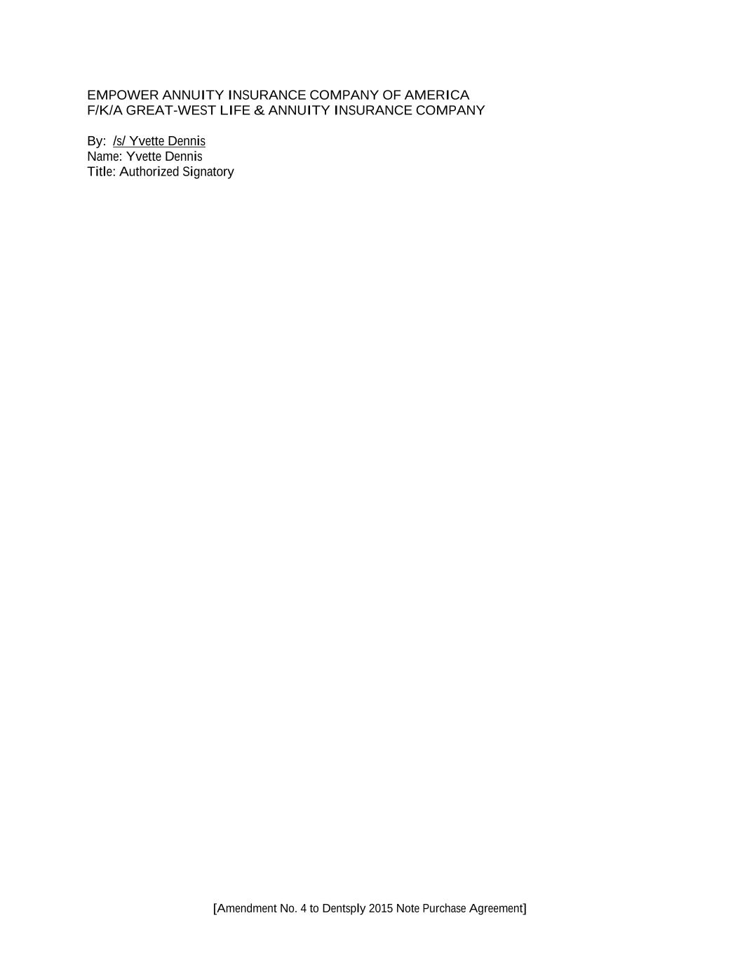 [Amendment No. 4 to Dentsply 2015 Note Purchase Agreement] EMPOWER ANNUITY INSURANCE COMPANY OF AMERICA F/K/A GREAT-WEST LIFE & ANNUITY INSURANCE COMPANY By: /s/ Yvette Dennis Name: Yvette Dennis Title: Authorized Signatory