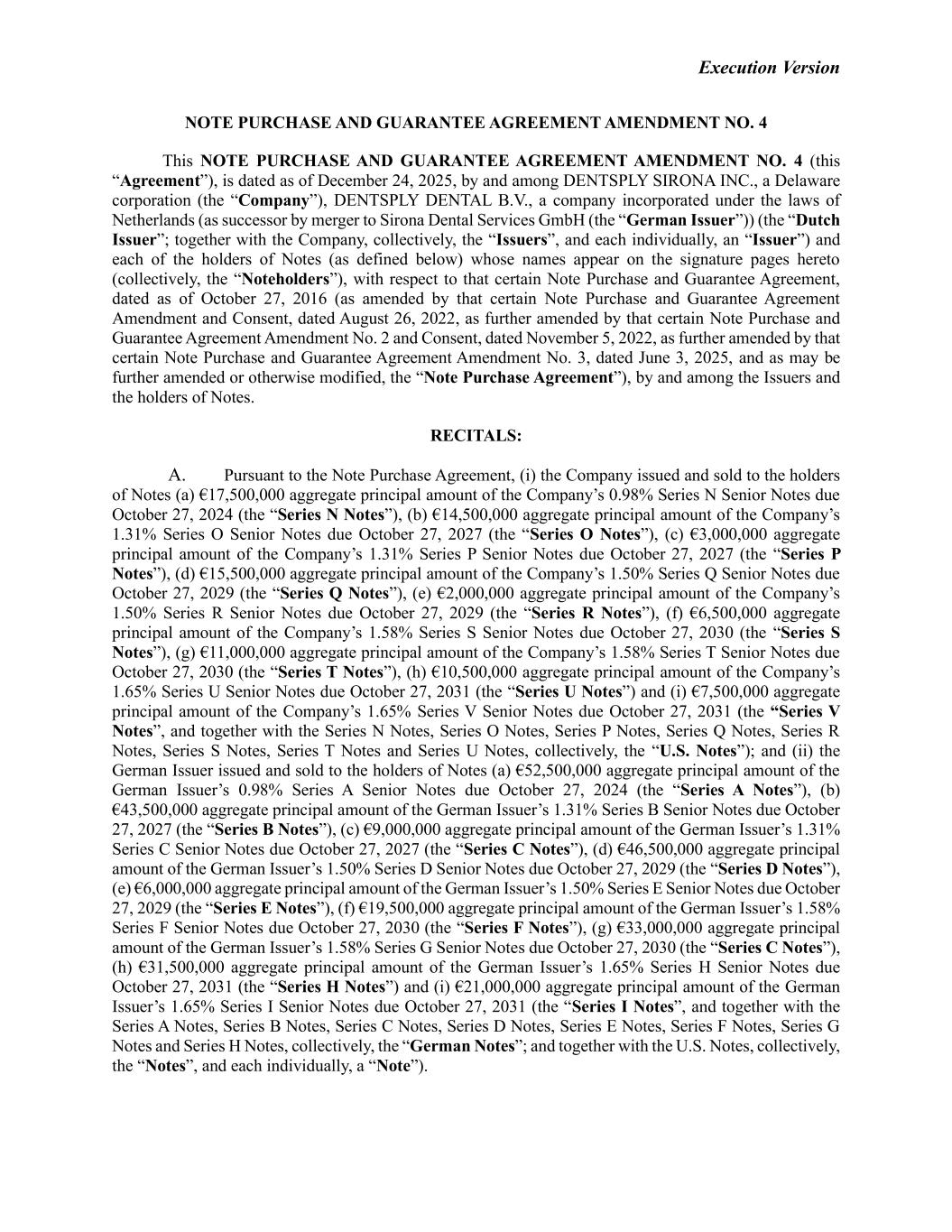 Execution Version NOTE PURCHASE AND GUARANTEE AGREEMENT AMENDMENT NO. 4 This NOTE PURCHASE AND GUARANTEE AGREEMENT AMENDMENT NO. 4 (this “Agreement”), is dated as of December 24, 2025, by and among DENTSPLY SIRONA INC., a Delaware corporation (the “Company”), DENTSPLY DENTAL B.V., a company incorporated under the laws of Netherlands (as successor by merger to Sirona Dental Services GmbH (the “German Issuer”)) (the “Dutch Issuer”; together with the Company, collectively, the “Issuers”, and each individually, an “Issuer”) and each of the holders of Notes (as defined below) whose names appear on the signature pages hereto (collectively, the “Noteholders”), with respect to that certain Note Purchase and Guarantee Agreement, dated as of October 27, 2016 (as amended by that certain Note Purchase and Guarantee Agreement Amendment and Consent, dated August 26, 2022, as further amended by that certain Note Purchase and Guarantee Agreement Amendment No. 2 and Consent, dated November 5, 2022, as further amended by that certain Note Purchase and Guarantee Agreement Amendment No. 3, dated June 3, 2025, and as may be further amended or otherwise modified, the “Note Purchase Agreement”), by and among the Issuers and the holders of Notes. RECITALS: A. Pursuant to the Note Purchase Agreement, (i) the Company issued and sold to the holders of Notes (a) €17,500,000 aggregate principal amount of the Company’s 0.98% Series N Senior Notes due October 27, 2024 (the “Series N Notes”), (b) €14,500,000 aggregate principal amount of the Company’s 1.31% Series O Senior Notes due October 27, 2027 (the “Series O Notes”), (c) €3,000,000 aggregate principal amount of the Company’s 1.31% Series P Senior Notes due October 27, 2027 (the “Series P Notes”), (d) €15,500,000 aggregate principal amount of the Company’s 1.50% Series Q Senior Notes due October 27, 2029 (the “Series Q Notes”), (e) €2,000,000 aggregate principal amount of the Company’s 1.50% Series R Senior Notes due October 27, 2029 (the “Series R Notes”), (f) €6,500,000 aggregate principal amount of the Company’s 1.58% Series S Senior Notes due October 27, 2030 (the “Series S Notes”), (g) €11,000,000 aggregate principal amount of the Company’s 1.58% Series T Senior Notes due October 27, 2030 (the “Series T Notes”), (h) €10,500,000 aggregate principal amount of the Company’s 1.65% Series U Senior Notes due October 27, 2031 (the “Series U Notes”) and (i) €7,500,000 aggregate principal amount of the Company’s 1.65% Series V Senior Notes due October 27, 2031 (the “Series V Notes”, and together with the Series N Notes, Series O Notes, Series P Notes, Series Q Notes, Series R Notes, Series S Notes, Series T Notes and Series U Notes, collectively, the “U.S. Notes”); and (ii) the German Issuer issued and sold to the holders of Notes (a) €52,500,000 aggregate principal amount of the German Issuer’s 0.98% Series A Senior Notes due October 27, 2024 (the “Series A Notes”), (b) €43,500,000 aggregate principal amount of the German Issuer’s 1.31% Series B Senior Notes due October 27, 2027 (the “Series B Notes”), (c) €9,000,000 aggregate principal amount of the German Issuer’s 1.31% Series C Senior Notes due October 27, 2027 (the “Series C Notes”), (d) €46,500,000 aggregate principal amount of the German Issuer’s 1.50% Series D Senior Notes due October 27, 2029 (the “Series D Notes”), (e) €6,000,000 aggregate principal amount of the German Issuer’s 1.50% Series E Senior Notes due October 27, 2029 (the “Series E Notes”), (f) €19,500,000 aggregate principal amount of the German Issuer’s 1.58% Series F Senior Notes due October 27, 2030 (the “Series F Notes”), (g) €33,000,000 aggregate principal amount of the German Issuer’s 1.58% Series G Senior Notes due October 27, 2030 (the “Series C Notes”), (h) €31,500,000 aggregate principal amount of the German Issuer’s 1.65% Series H Senior Notes due October 27, 2031 (the “Series H Notes”) and (i) €21,000,000 aggregate principal amount of the German Issuer’s 1.65% Series I Senior Notes due October 27, 2031 (the “Series I Notes”, and together with the Series A Notes, Series B Notes, Series C Notes, Series D Notes, Series E Notes, Series F Notes, Series G Notes and Series H Notes, collectively, the “German Notes”; and together with the U.S. Notes, collectively, the “Notes”, and each individually, a “Note”).