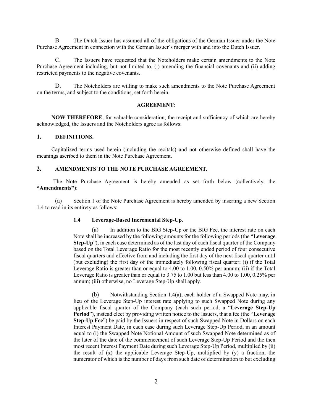 2 B. The Dutch Issuer has assumed all of the obligations of the German Issuer under the Note Purchase Agreement in connection with the German Issuer’s merger with and into the Dutch Issuer. C. The Issuers have requested that the Noteholders make certain amendments to the Note Purchase Agreement including, but not limited to, (i) amending the financial covenants and (ii) adding restricted payments to the negative covenants. D. The Noteholders are willing to make such amendments to the Note Purchase Agreement on the terms, and subject to the conditions, set forth herein. AGREEMENT: NOW THEREFORE, for valuable consideration, the receipt and sufficiency of which are hereby acknowledged, the Issuers and the Noteholders agree as follows: 1. DEFINITIONS. Capitalized terms used herein (including the recitals) and not otherwise defined shall have the meanings ascribed to them in the Note Purchase Agreement. 2. AMENDMENTS TO THE NOTE PURCHASE AGREEMENT. The Note Purchase Agreement is hereby amended as set forth below (collectively, the “Amendments”): (a) Section 1 of the Note Purchase Agreement is hereby amended by inserting a new Section 1.4 to read in its entirety as follows: 1.4 Leverage-Based Incremental Step-Up. (a) In addition to the BIG Step-Up or the BIG Fee, the interest rate on each Note shall be increased by the following amounts for the following periods (the “Leverage Step-Up”), in each case determined as of the last day of each fiscal quarter of the Company based on the Total Leverage Ratio for the most recently ended period of four consecutive fiscal quarters and effective from and including the first day of the next fiscal quarter until (but excluding) the first day of the immediately following fiscal quarter: (i) if the Total Leverage Ratio is greater than or equal to 4.00 to 1.00, 0.50% per annum; (ii) if the Total Leverage Ratio is greater than or equal to 3.75 to 1.00 but less than 4.00 to 1.00, 0.25% per annum; (iii) otherwise, no Leverage Step-Up shall apply. (b) Notwithstanding Section 1.4(a), each holder of a Swapped Note may, in lieu of the Leverage Step-Up interest rate applying to such Swapped Note during any applicable fiscal quarter of the Company (each such period, a “Leverage Step-Up Period”), instead elect by providing written notice to the Issuers, that a fee (the “Leverage Step-Up Fee”) be paid by the Issuers in respect of such Swapped Note in Dollars on each Interest Payment Date, in each case during such Leverage Step-Up Period, in an amount equal to (i) the Swapped Note Notional Amount of such Swapped Note determined as of the later of the date of the commencement of such Leverage Step-Up Period and the then most recent Interest Payment Date during such Leverage Step-Up Period, multiplied by (ii) the result of (x) the applicable Leverage Step-Up, multiplied by (y) a fraction, the numerator of which is the number of days from such date of determination to but excluding
