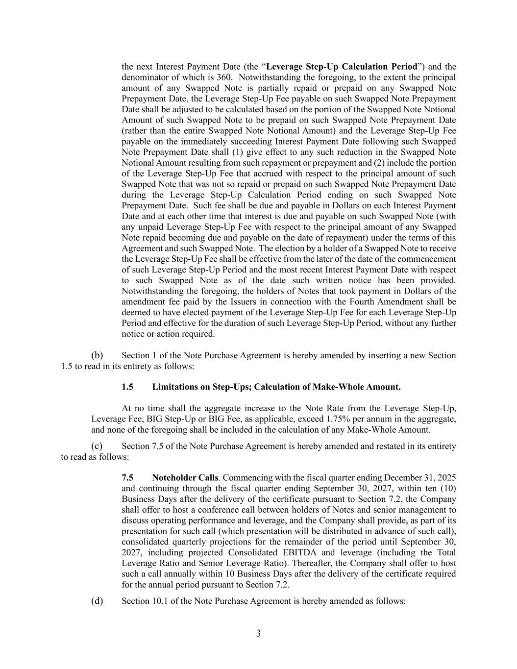 3 the next Interest Payment Date (the “Leverage Step-Up Calculation Period”) and the denominator of which is 360. Notwithstanding the foregoing, to the extent the principal amount of any Swapped Note is partially repaid or prepaid on any Swapped Note Prepayment Date, the Leverage Step-Up Fee payable on such Swapped Note Prepayment Date shall be adjusted to be calculated based on the portion of the Swapped Note Notional Amount of such Swapped Note to be prepaid on such Swapped Note Prepayment Date (rather than the entire Swapped Note Notional Amount) and the Leverage Step-Up Fee payable on the immediately succeeding Interest Payment Date following such Swapped Note Prepayment Date shall (1) give effect to any such reduction in the Swapped Note Notional Amount resulting from such repayment or prepayment and (2) include the portion of the Leverage Step-Up Fee that accrued with respect to the principal amount of such Swapped Note that was not so repaid or prepaid on such Swapped Note Prepayment Date during the Leverage Step-Up Calculation Period ending on such Swapped Note Prepayment Date. Such fee shall be due and payable in Dollars on each Interest Payment Date and at each other time that interest is due and payable on such Swapped Note (with any unpaid Leverage Step-Up Fee with respect to the principal amount of any Swapped Note repaid becoming due and payable on the date of repayment) under the terms of this Agreement and such Swapped Note. The election by a holder of a Swapped Note to receive the Leverage Step-Up Fee shall be effective from the later of the date of the commencement of such Leverage Step-Up Period and the most recent Interest Payment Date with respect to such Swapped Note as of the date such written notice has been provided. Notwithstanding the foregoing, the holders of Notes that took payment in Dollars of the amendment fee paid by the Issuers in connection with the Fourth Amendment shall be deemed to have elected payment of the Leverage Step-Up Fee for each Leverage Step-Up Period and effective for the duration of such Leverage Step-Up Period, without any further notice or action required. (b) Section 1 of the Note Purchase Agreement is hereby amended by inserting a new Section 1.5 to read in its entirety as follows: 1.5 Limitations on Step-Ups; Calculation of Make-Whole Amount. At no time shall the aggregate increase to the Note Rate from the Leverage Step-Up, Leverage Fee, BIG Step-Up or BIG Fee, as applicable, exceed 1.75% per annum in the aggregate, and none of the foregoing shall be included in the calculation of any Make-Whole Amount. (c) Section 7.5 of the Note Purchase Agreement is hereby amended and restated in its entirety to read as follows: 7.5 Noteholder Calls. Commencing with the fiscal quarter ending December 31, 2025 and continuing through the fiscal quarter ending September 30, 2027, within ten (10) Business Days after the delivery of the certificate pursuant to Section 7.2, the Company shall offer to host a conference call between holders of Notes and senior management to discuss operating performance and leverage, and the Company shall provide, as part of its presentation for such call (which presentation will be distributed in advance of such call), consolidated quarterly projections for the remainder of the period until September 30, 2027, including projected Consolidated EBITDA and leverage (including the Total Leverage Ratio and Senior Leverage Ratio). Thereafter, the Company shall offer to host such a call annually within 10 Business Days after the delivery of the certificate required for the annual period pursuant to Section 7.2. (d) Section 10.1 of the Note Purchase Agreement is hereby amended as follows: