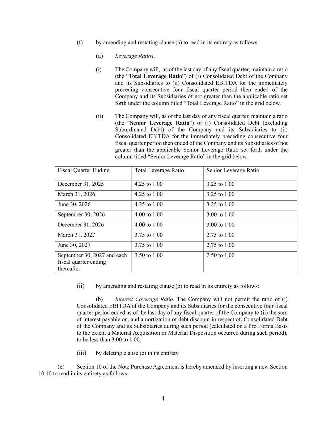4 (i) by amending and restating clause (a) to read in its entirety as follows: (a) Leverage Ratios. (i) The Company will, as of the last day of any fiscal quarter, maintain a ratio (the “Total Leverage Ratio”) of (i) Consolidated Debt of the Company and its Subsidiaries to (ii) Consolidated EBITDA for the immediately preceding consecutive four fiscal quarter period then ended of the Company and its Subsidiaries of not greater than the applicable ratio set forth under the column titled “Total Leverage Ratio” in the grid below. (ii) The Company will, as of the last day of any fiscal quarter, maintain a ratio (the “Senior Leverage Ratio”) of (i) Consolidated Debt (excluding Subordinated Debt) of the Company and its Subsidiaries to (ii) Consolidated EBITDA for the immediately preceding consecutive four fiscal quarter period then ended of the Company and its Subsidiaries of not greater than the applicable Senior Leverage Ratio set forth under the column titled “Senior Leverage Ratio” in the grid below. Fiscal Quarter Ending Total Leverage Ratio Senior Leverage Ratio December 31, 2025 4.25 to 1.00 3.25 to 1.00 March 31, 2026 4.25 to 1.00 3.25 to 1.00 June 30, 2026 4.25 to 1.00 3.25 to 1.00 September 30, 2026 4.00 to 1.00 3.00 to 1.00 December 31, 2026 4.00 to 1.00 3.00 to 1.00 March 31, 2027 3.75 to 1.00 2.75 to 1.00 June 30, 2027 3.75 to 1.00 2.75 to 1.00 September 30, 2027 and each fiscal quarter ending thereafter 3.50 to 1.00 2.50 to 1.00 (ii) by amending and restating clause (b) to read in its entirety as follows: (b) Interest Coverage Ratio. The Company will not permit the ratio of (i) Consolidated EBITDA of the Company and its Subsidiaries for the consecutive four fiscal quarter period ended as of the last day of any fiscal quarter of the Company to (ii) the sum of interest payable on, and amortization of debt discount in respect of, Consolidated Debt of the Company and its Subsidiaries during such period (calculated on a Pro Forma Basis to the extent a Material Acquisition or Material Disposition occurred during such period), to be less than 3.00 to 1.00. (iii) by deleting clause (c) in its entirety. (e) Section 10 of the Note Purchase Agreement is hereby amended by inserting a new Section 10.10 to read in its entirety as follows: