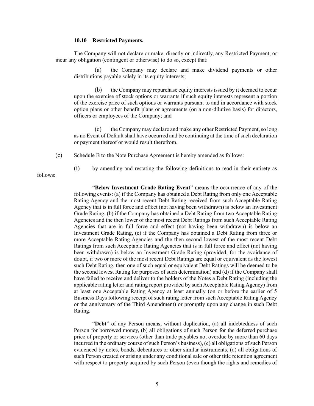 5 10.10 Restricted Payments. The Company will not declare or make, directly or indirectly, any Restricted Payment, or incur any obligation (contingent or otherwise) to do so, except that: (a) the Company may declare and make dividend payments or other distributions payable solely in its equity interests; (b) the Company may repurchase equity interests issued by it deemed to occur upon the exercise of stock options or warrants if such equity interests represent a portion of the exercise price of such options or warrants pursuant to and in accordance with stock option plans or other benefit plans or agreements (on a non-dilutive basis) for directors, officers or employees of the Company; and (c) the Company may declare and make any other Restricted Payment, so long as no Event of Default shall have occurred and be continuing at the time of such declaration or payment thereof or would result therefrom. (c) Schedule B to the Note Purchase Agreement is hereby amended as follows: (i) by amending and restating the following definitions to read in their entirety as follows: “Below Investment Grade Rating Event” means the occurrence of any of the following events: (a) if the Company has obtained a Debt Rating from only one Acceptable Rating Agency and the most recent Debt Rating received from such Acceptable Rating Agency that is in full force and effect (not having been withdrawn) is below an Investment Grade Rating, (b) if the Company has obtained a Debt Rating from two Acceptable Rating Agencies and the then lower of the most recent Debt Ratings from such Acceptable Rating Agencies that are in full force and effect (not having been withdrawn) is below an Investment Grade Rating, (c) if the Company has obtained a Debt Rating from three or more Acceptable Rating Agencies and the then second lowest of the most recent Debt Ratings from such Acceptable Rating Agencies that is in full force and effect (not having been withdrawn) is below an Investment Grade Rating (provided, for the avoidance of doubt, if two or more of the most recent Debt Ratings are equal or equivalent as the lowest such Debt Rating, then one of such equal or equivalent Debt Ratings will be deemed to be the second lowest Rating for purposes of such determination) and (d) if the Company shall have failed to receive and deliver to the holders of the Notes a Debt Rating (including the applicable rating letter and rating report provided by such Acceptable Rating Agency) from at least one Acceptable Rating Agency at least annually (on or before the earlier of 5 Business Days following receipt of such rating letter from such Acceptable Rating Agency or the anniversary of the Third Amendment) or promptly upon any change in such Debt Rating. “Debt” of any Person means, without duplication, (a) all indebtedness of such Person for borrowed money, (b) all obligations of such Person for the deferred purchase price of property or services (other than trade payables not overdue by more than 60 days incurred in the ordinary course of such Person’s business), (c) all obligations of such Person evidenced by notes, bonds, debentures or other similar instruments, (d) all obligations of such Person created or arising under any conditional sale or other title retention agreement with respect to property acquired by such Person (even though the rights and remedies of