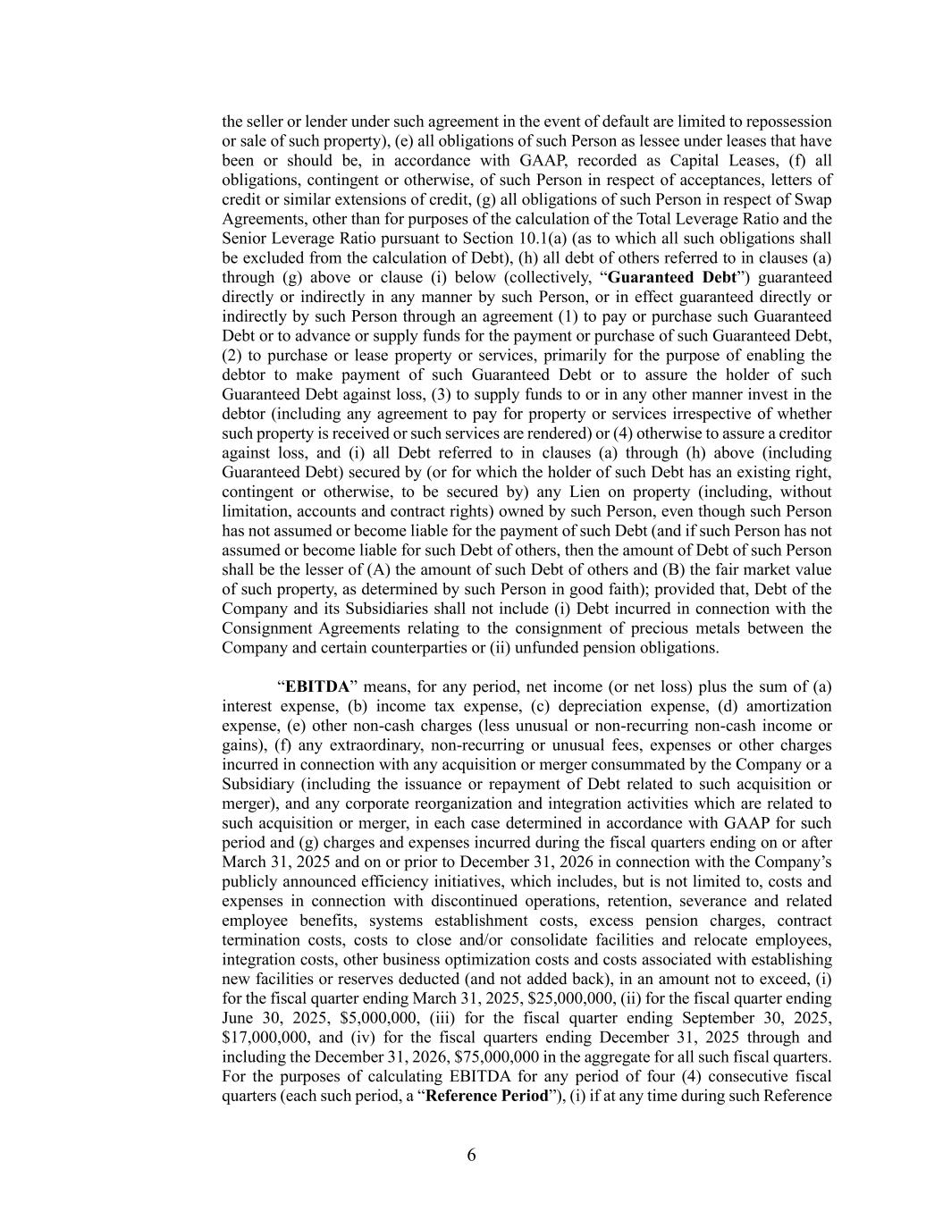 6 the seller or lender under such agreement in the event of default are limited to repossession or sale of such property), (e) all obligations of such Person as lessee under leases that have been or should be, in accordance with GAAP, recorded as Capital Leases, (f) all obligations, contingent or otherwise, of such Person in respect of acceptances, letters of credit or similar extensions of credit, (g) all obligations of such Person in respect of Swap Agreements, other than for purposes of the calculation of the Total Leverage Ratio and the Senior Leverage Ratio pursuant to Section 10.1(a) (as to which all such obligations shall be excluded from the calculation of Debt), (h) all debt of others referred to in clauses (a) through (g) above or clause (i) below (collectively, “Guaranteed Debt”) guaranteed directly or indirectly in any manner by such Person, or in effect guaranteed directly or indirectly by such Person through an agreement (1) to pay or purchase such Guaranteed Debt or to advance or supply funds for the payment or purchase of such Guaranteed Debt, (2) to purchase or lease property or services, primarily for the purpose of enabling the debtor to make payment of such Guaranteed Debt or to assure the holder of such Guaranteed Debt against loss, (3) to supply funds to or in any other manner invest in the debtor (including any agreement to pay for property or services irrespective of whether such property is received or such services are rendered) or (4) otherwise to assure a creditor against loss, and (i) all Debt referred to in clauses (a) through (h) above (including Guaranteed Debt) secured by (or for which the holder of such Debt has an existing right, contingent or otherwise, to be secured by) any Lien on property (including, without limitation, accounts and contract rights) owned by such Person, even though such Person has not assumed or become liable for the payment of such Debt (and if such Person has not assumed or become liable for such Debt of others, then the amount of Debt of such Person shall be the lesser of (A) the amount of such Debt of others and (B) the fair market value of such property, as determined by such Person in good faith); provided that, Debt of the Company and its Subsidiaries shall not include (i) Debt incurred in connection with the Consignment Agreements relating to the consignment of precious metals between the Company and certain counterparties or (ii) unfunded pension obligations. “EBITDA” means, for any period, net income (or net loss) plus the sum of (a) interest expense, (b) income tax expense, (c) depreciation expense, (d) amortization expense, (e) other non-cash charges (less unusual or non-recurring non-cash income or gains), (f) any extraordinary, non-recurring or unusual fees, expenses or other charges incurred in connection with any acquisition or merger consummated by the Company or a Subsidiary (including the issuance or repayment of Debt related to such acquisition or merger), and any corporate reorganization and integration activities which are related to such acquisition or merger, in each case determined in accordance with GAAP for such period and (g) charges and expenses incurred during the fiscal quarters ending on or after March 31, 2025 and on or prior to December 31, 2026 in connection with the Company’s publicly announced efficiency initiatives, which includes, but is not limited to, costs and expenses in connection with discontinued operations, retention, severance and related employee benefits, systems establishment costs, excess pension charges, contract termination costs, costs to close and/or consolidate facilities and relocate employees, integration costs, other business optimization costs and costs associated with establishing new facilities or reserves deducted (and not added back), in an amount not to exceed, (i) for the fiscal quarter ending March 31, 2025, $25,000,000, (ii) for the fiscal quarter ending June 30, 2025, $5,000,000, (iii) for the fiscal quarter ending September 30, 2025, $17,000,000, and (iv) for the fiscal quarters ending December 31, 2025 through and including the December 31, 2026, $75,000,000 in the aggregate for all such fiscal quarters. For the purposes of calculating EBITDA for any period of four (4) consecutive fiscal quarters (each such period, a “Reference Period”), (i) if at any time during such Reference