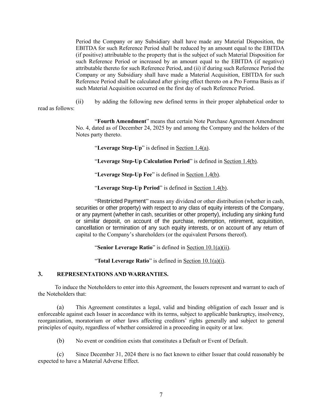 7 Period the Company or any Subsidiary shall have made any Material Disposition, the EBITDA for such Reference Period shall be reduced by an amount equal to the EBITDA (if positive) attributable to the property that is the subject of such Material Disposition for such Reference Period or increased by an amount equal to the EBITDA (if negative) attributable thereto for such Reference Period, and (ii) if during such Reference Period the Company or any Subsidiary shall have made a Material Acquisition, EBITDA for such Reference Period shall be calculated after giving effect thereto on a Pro Forma Basis as if such Material Acquisition occurred on the first day of such Reference Period. (ii) by adding the following new defined terms in their proper alphabetical order to read as follows: “Fourth Amendment” means that certain Note Purchase Agreement Amendment No. 4, dated as of December 24, 2025 by and among the Company and the holders of the Notes party thereto. “Leverage Step-Up” is defined in Section 1.4(a). “Leverage Step-Up Calculation Period” is defined in Section 1.4(b). “Leverage Step-Up Fee” is defined in Section 1.4(b). “Leverage Step-Up Period” is defined in Section 1.4(b). “Restricted Payment” means any dividend or other distribution (whether in cash, securities or other property) with respect to any class of equity interests of the Company, or any payment (whether in cash, securities or other property), including any sinking fund or similar deposit, on account of the purchase, redemption, retirement, acquisition, cancellation or termination of any such equity interests, or on account of any return of capital to the Company’s shareholders (or the equivalent Persons thereof). “Senior Leverage Ratio” is defined in Section 10.1(a)(ii). “Total Leverage Ratio” is defined in Section 10.1(a)(i). 3. REPRESENTATIONS AND WARRANTIES. To induce the Noteholders to enter into this Agreement, the Issuers represent and warrant to each of the Noteholders that: (a) This Agreement constitutes a legal, valid and binding obligation of each Issuer and is enforceable against each Issuer in accordance with its terms, subject to applicable bankruptcy, insolvency, reorganization, moratorium or other laws affecting creditors’ rights generally and subject to general principles of equity, regardless of whether considered in a proceeding in equity or at law. (b) No event or condition exists that constitutes a Default or Event of Default. (c) Since December 31, 2024 there is no fact known to either Issuer that could reasonably be expected to have a Material Adverse Effect.
