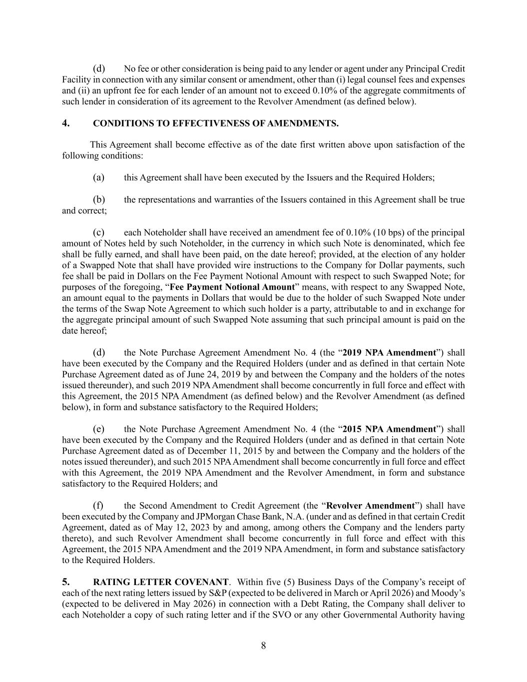 8 (d) No fee or other consideration is being paid to any lender or agent under any Principal Credit Facility in connection with any similar consent or amendment, other than (i) legal counsel fees and expenses and (ii) an upfront fee for each lender of an amount not to exceed 0.10% of the aggregate commitments of such lender in consideration of its agreement to the Revolver Amendment (as defined below). 4. CONDITIONS TO EFFECTIVENESS OF AMENDMENTS. This Agreement shall become effective as of the date first written above upon satisfaction of the following conditions: (a) this Agreement shall have been executed by the Issuers and the Required Holders; (b) the representations and warranties of the Issuers contained in this Agreement shall be true and correct; (c) each Noteholder shall have received an amendment fee of 0.10% (10 bps) of the principal amount of Notes held by such Noteholder, in the currency in which such Note is denominated, which fee shall be fully earned, and shall have been paid, on the date hereof; provided, at the election of any holder of a Swapped Note that shall have provided wire instructions to the Company for Dollar payments, such fee shall be paid in Dollars on the Fee Payment Notional Amount with respect to such Swapped Note; for purposes of the foregoing, “Fee Payment Notional Amount” means, with respect to any Swapped Note, an amount equal to the payments in Dollars that would be due to the holder of such Swapped Note under the terms of the Swap Note Agreement to which such holder is a party, attributable to and in exchange for the aggregate principal amount of such Swapped Note assuming that such principal amount is paid on the date hereof; (d) the Note Purchase Agreement Amendment No. 4 (the “2019 NPA Amendment”) shall have been executed by the Company and the Required Holders (under and as defined in that certain Note Purchase Agreement dated as of June 24, 2019 by and between the Company and the holders of the notes issued thereunder), and such 2019 NPA Amendment shall become concurrently in full force and effect with this Agreement, the 2015 NPA Amendment (as defined below) and the Revolver Amendment (as defined below), in form and substance satisfactory to the Required Holders; (e) the Note Purchase Agreement Amendment No. 4 (the “2015 NPA Amendment”) shall have been executed by the Company and the Required Holders (under and as defined in that certain Note Purchase Agreement dated as of December 11, 2015 by and between the Company and the holders of the notes issued thereunder), and such 2015 NPA Amendment shall become concurrently in full force and effect with this Agreement, the 2019 NPA Amendment and the Revolver Amendment, in form and substance satisfactory to the Required Holders; and (f) the Second Amendment to Credit Agreement (the “Revolver Amendment”) shall have been executed by the Company and JPMorgan Chase Bank, N.A. (under and as defined in that certain Credit Agreement, dated as of May 12, 2023 by and among, among others the Company and the lenders party thereto), and such Revolver Amendment shall become concurrently in full force and effect with this Agreement, the 2015 NPA Amendment and the 2019 NPA Amendment, in form and substance satisfactory to the Required Holders. 5. RATING LETTER COVENANT. Within five (5) Business Days of the Company’s receipt of each of the next rating letters issued by S&P (expected to be delivered in March or April 2026) and Moody’s (expected to be delivered in May 2026) in connection with a Debt Rating, the Company shall deliver to each Noteholder a copy of such rating letter and if the SVO or any other Governmental Authority having