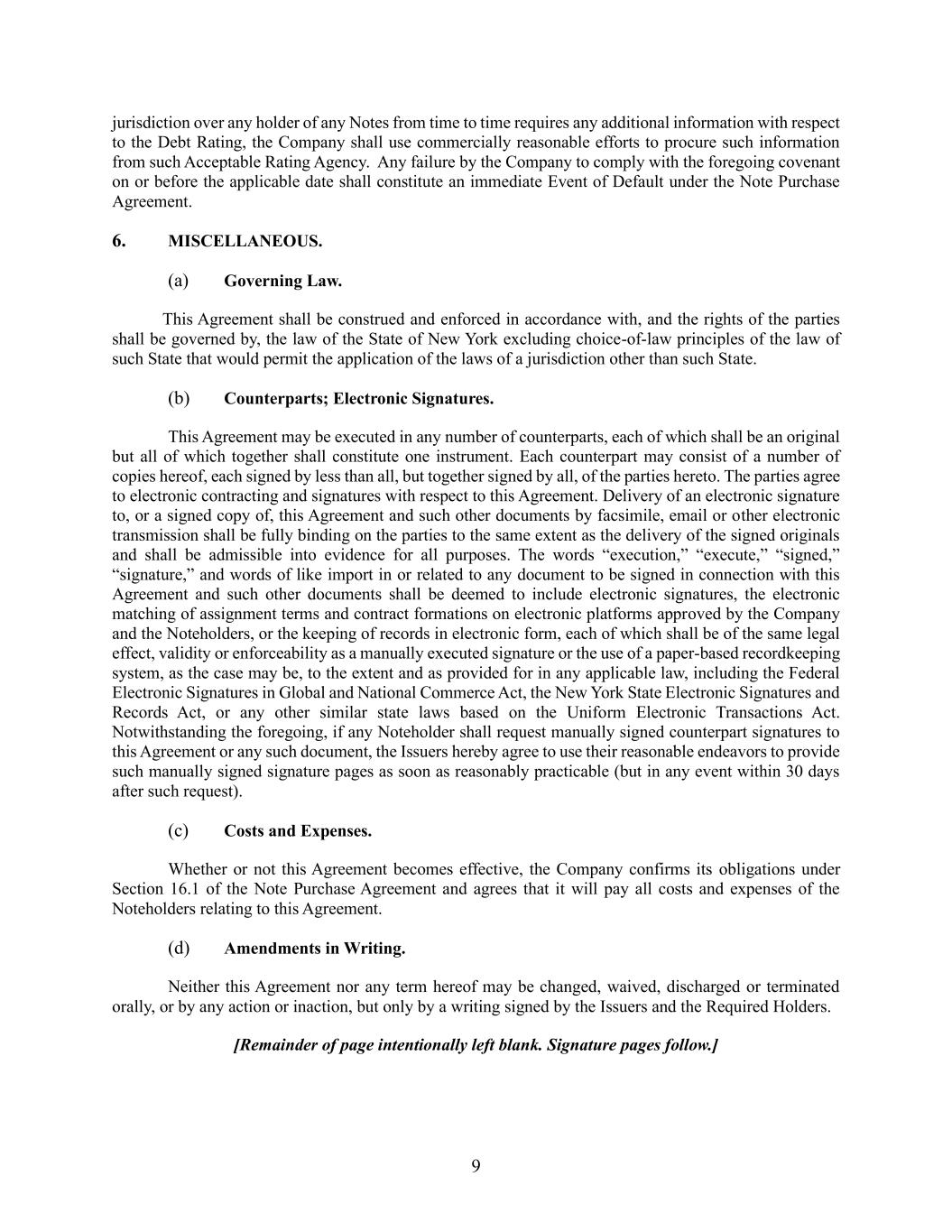 9 jurisdiction over any holder of any Notes from time to time requires any additional information with respect to the Debt Rating, the Company shall use commercially reasonable efforts to procure such information from such Acceptable Rating Agency. Any failure by the Company to comply with the foregoing covenant on or before the applicable date shall constitute an immediate Event of Default under the Note Purchase Agreement. 6. MISCELLANEOUS. (a) Governing Law. This Agreement shall be construed and enforced in accordance with, and the rights of the parties shall be governed by, the law of the State of New York excluding choice-of-law principles of the law of such State that would permit the application of the laws of a jurisdiction other than such State. (b) Counterparts; Electronic Signatures. This Agreement may be executed in any number of counterparts, each of which shall be an original but all of which together shall constitute one instrument. Each counterpart may consist of a number of copies hereof, each signed by less than all, but together signed by all, of the parties hereto. The parties agree to electronic contracting and signatures with respect to this Agreement. Delivery of an electronic signature to, or a signed copy of, this Agreement and such other documents by facsimile, email or other electronic transmission shall be fully binding on the parties to the same extent as the delivery of the signed originals and shall be admissible into evidence for all purposes. The words “execution,” “execute,” “signed,” “signature,” and words of like import in or related to any document to be signed in connection with this Agreement and such other documents shall be deemed to include electronic signatures, the electronic matching of assignment terms and contract formations on electronic platforms approved by the Company and the Noteholders, or the keeping of records in electronic form, each of which shall be of the same legal effect, validity or enforceability as a manually executed signature or the use of a paper-based recordkeeping system, as the case may be, to the extent and as provided for in any applicable law, including the Federal Electronic Signatures in Global and National Commerce Act, the New York State Electronic Signatures and Records Act, or any other similar state laws based on the Uniform Electronic Transactions Act. Notwithstanding the foregoing, if any Noteholder shall request manually signed counterpart signatures to this Agreement or any such document, the Issuers hereby agree to use their reasonable endeavors to provide such manually signed signature pages as soon as reasonably practicable (but in any event within 30 days after such request). (c) Costs and Expenses. Whether or not this Agreement becomes effective, the Company confirms its obligations under Section 16.1 of the Note Purchase Agreement and agrees that it will pay all costs and expenses of the Noteholders relating to this Agreement. (d) Amendments in Writing. Neither this Agreement nor any term hereof may be changed, waived, discharged or terminated orally, or by any action or inaction, but only by a writing signed by the Issuers and the Required Holders. [Remainder of page intentionally left blank. Signature pages follow.]