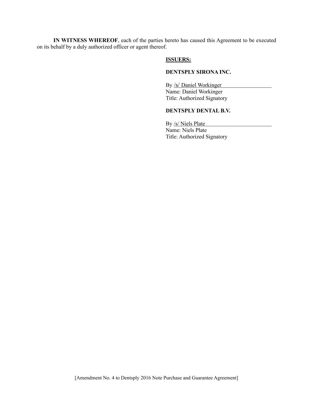 [Amendment No. 4 to Dentsply 2016 Note Purchase and Guarantee Agreement] IN WITNESS WHEREOF, each of the parties hereto has caused this Agreement to be executed on its behalf by a duly authorized officer or agent thereof. ISSUERS: DENTSPLY SIRONA INC. By /s/ Daniel Workinger Name: Daniel Workinger Title: Authorized Signatory DENTSPLY DENTAL B.V. By /s/ Niels Plate Name: Niels Plate Title: Authorized Signatory