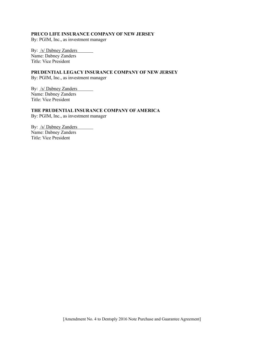 [Amendment No. 4 to Dentsply 2016 Note Purchase and Guarantee Agreement] PRUCO LIFE INSURANCE COMPANY OF NEW JERSEY By: PGIM, Inc., as investment manager By: /s/ Dabney Zanders Name: Dabney Zanders Title: Vice President PRUDENTIAL LEGACY INSURANCE COMPANY OF NEW JERSEY By: PGIM, Inc., as investment manager By: /s/ Dabney Zanders Name: Dabney Zanders Title: Vice President THE PRUDENTIAL INSURANCE COMPANY OF AMERICA By: PGIM, Inc., as investment manager By: /s/ Dabney Zanders Name: Dabney Zanders Title: Vice President
