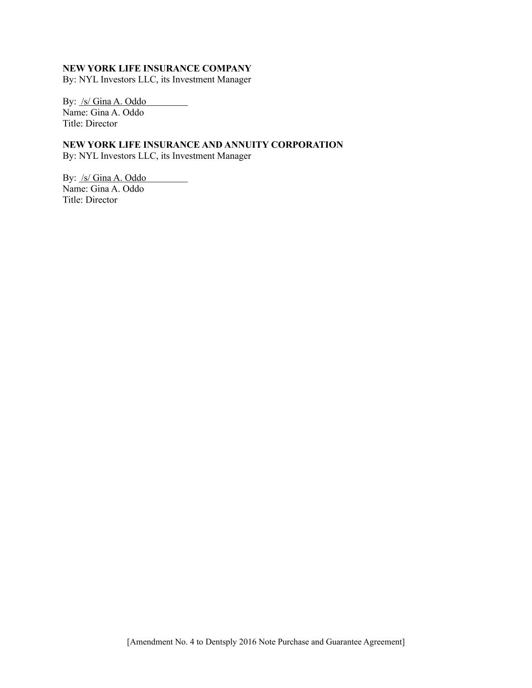 [Amendment No. 4 to Dentsply 2016 Note Purchase and Guarantee Agreement] NEW YORK LIFE INSURANCE COMPANY By: NYL Investors LLC, its Investment Manager By: /s/ Gina A. Oddo Name: Gina A. Oddo Title: Director NEW YORK LIFE INSURANCE AND ANNUITY CORPORATION By: NYL Investors LLC, its Investment Manager By: /s/ Gina A. Oddo Name: Gina A. Oddo Title: Director