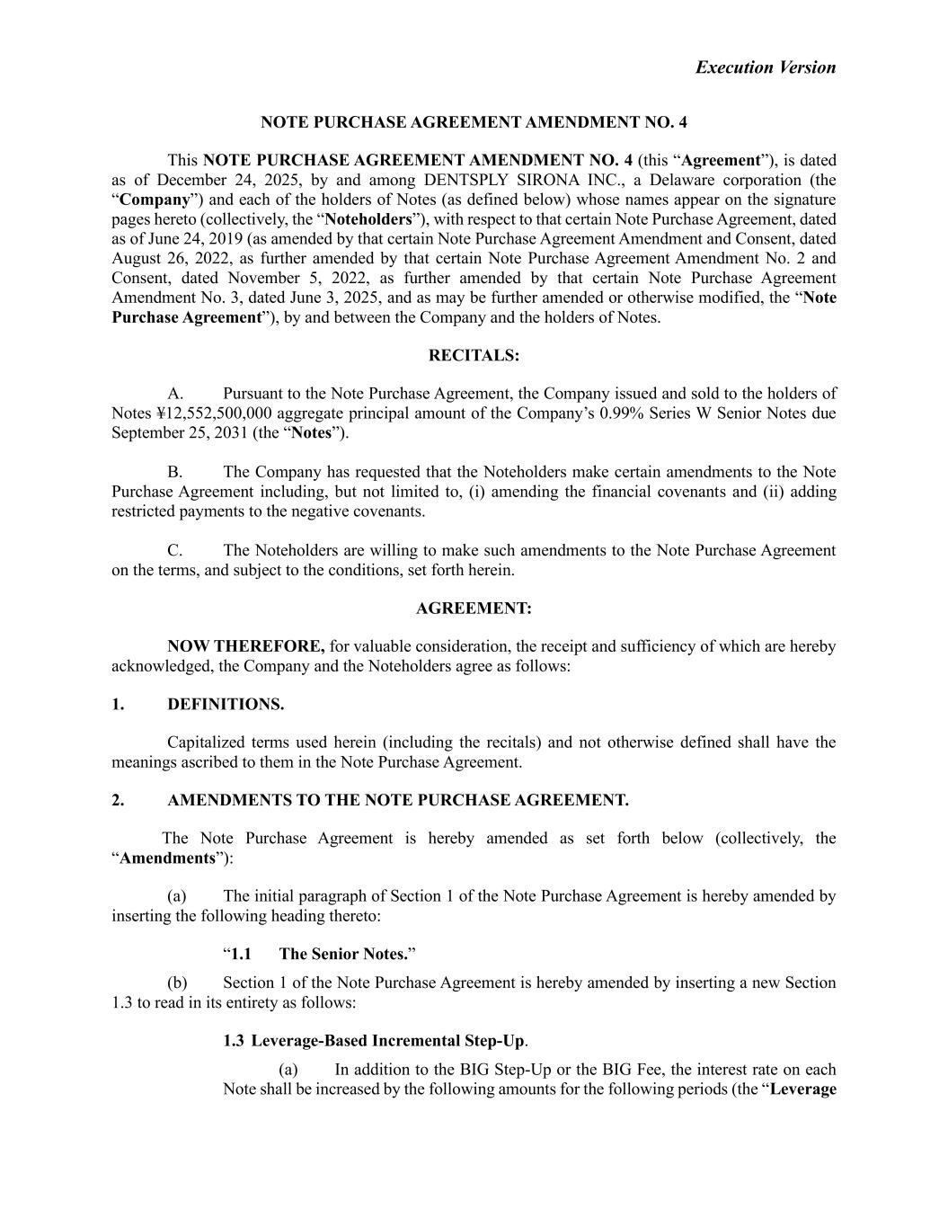 Execution Version NOTE PURCHASE AGREEMENT AMENDMENT NO. 4 This NOTE PURCHASE AGREEMENT AMENDMENT NO. 4 (this “Agreement”), is dated as of December 24, 2025, by and among DENTSPLY SIRONA INC., a Delaware corporation (the “Company”) and each of the holders of Notes (as defined below) whose names appear on the signature pages hereto (collectively, the “Noteholders”), with respect to that certain Note Purchase Agreement, dated as of June 24, 2019 (as amended by that certain Note Purchase Agreement Amendment and Consent, dated August 26, 2022, as further amended by that certain Note Purchase Agreement Amendment No. 2 and Consent, dated November 5, 2022, as further amended by that certain Note Purchase Agreement Amendment No. 3, dated June 3, 2025, and as may be further amended or otherwise modified, the “Note Purchase Agreement”), by and between the Company and the holders of Notes. RECITALS: A. Pursuant to the Note Purchase Agreement, the Company issued and sold to the holders of Notes ¥12,552,500,000 aggregate principal amount of the Company’s 0.99% Series W Senior Notes due September 25, 2031 (the “Notes”). B. The Company has requested that the Noteholders make certain amendments to the Note Purchase Agreement including, but not limited to, (i) amending the financial covenants and (ii) adding restricted payments to the negative covenants. C. The Noteholders are willing to make such amendments to the Note Purchase Agreement on the terms, and subject to the conditions, set forth herein. AGREEMENT: NOW THEREFORE, for valuable consideration, the receipt and sufficiency of which are hereby acknowledged, the Company and the Noteholders agree as follows: 1. DEFINITIONS. Capitalized terms used herein (including the recitals) and not otherwise defined shall have the meanings ascribed to them in the Note Purchase Agreement. 2. AMENDMENTS TO THE NOTE PURCHASE AGREEMENT. The Note Purchase Agreement is hereby amended as set forth below (collectively, the “Amendments”): (a) The initial paragraph of Section 1 of the Note Purchase Agreement is hereby amended by inserting the following heading thereto: “1.1 The Senior Notes.” (b) Section 1 of the Note Purchase Agreement is hereby amended by inserting a new Section 1.3 to read in its entirety as follows: 1.3 Leverage-Based Incremental Step-Up. (a) In addition to the BIG Step-Up or the BIG Fee, the interest rate on each Note shall be increased by the following amounts for the following periods (the “Leverage