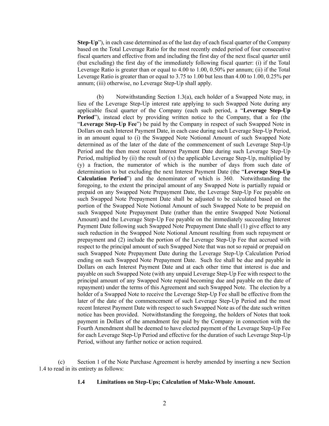 2 Step-Up”), in each case determined as of the last day of each fiscal quarter of the Company based on the Total Leverage Ratio for the most recently ended period of four consecutive fiscal quarters and effective from and including the first day of the next fiscal quarter until (but excluding) the first day of the immediately following fiscal quarter: (i) if the Total Leverage Ratio is greater than or equal to 4.00 to 1.00, 0.50% per annum; (ii) if the Total Leverage Ratio is greater than or equal to 3.75 to 1.00 but less than 4.00 to 1.00, 0.25% per annum; (iii) otherwise, no Leverage Step-Up shall apply. (b) Notwithstanding Section 1.3(a), each holder of a Swapped Note may, in lieu of the Leverage Step-Up interest rate applying to such Swapped Note during any applicable fiscal quarter of the Company (each such period, a “Leverage Step-Up Period”), instead elect by providing written notice to the Company, that a fee (the “Leverage Step-Up Fee”) be paid by the Company in respect of such Swapped Note in Dollars on each Interest Payment Date, in each case during such Leverage Step-Up Period, in an amount equal to (i) the Swapped Note Notional Amount of such Swapped Note determined as of the later of the date of the commencement of such Leverage Step-Up Period and the then most recent Interest Payment Date during such Leverage Step-Up Period, multiplied by (ii) the result of (x) the applicable Leverage Step-Up, multiplied by (y) a fraction, the numerator of which is the number of days from such date of determination to but excluding the next Interest Payment Date (the “Leverage Step-Up Calculation Period”) and the denominator of which is 360. Notwithstanding the foregoing, to the extent the principal amount of any Swapped Note is partially repaid or prepaid on any Swapped Note Prepayment Date, the Leverage Step-Up Fee payable on such Swapped Note Prepayment Date shall be adjusted to be calculated based on the portion of the Swapped Note Notional Amount of such Swapped Note to be prepaid on such Swapped Note Prepayment Date (rather than the entire Swapped Note Notional Amount) and the Leverage Step-Up Fee payable on the immediately succeeding Interest Payment Date following such Swapped Note Prepayment Date shall (1) give effect to any such reduction in the Swapped Note Notional Amount resulting from such repayment or prepayment and (2) include the portion of the Leverage Step-Up Fee that accrued with respect to the principal amount of such Swapped Note that was not so repaid or prepaid on such Swapped Note Prepayment Date during the Leverage Step-Up Calculation Period ending on such Swapped Note Prepayment Date. Such fee shall be due and payable in Dollars on each Interest Payment Date and at each other time that interest is due and payable on such Swapped Note (with any unpaid Leverage Step-Up Fee with respect to the principal amount of any Swapped Note repaid becoming due and payable on the date of repayment) under the terms of this Agreement and such Swapped Note. The election by a holder of a Swapped Note to receive the Leverage Step-Up Fee shall be effective from the later of the date of the commencement of such Leverage Step-Up Period and the most recent Interest Payment Date with respect to such Swapped Note as of the date such written notice has been provided. Notwithstanding the foregoing, the holders of Notes that took payment in Dollars of the amendment fee paid by the Company in connection with the Fourth Amendment shall be deemed to have elected payment of the Leverage Step-Up Fee for each Leverage Step-Up Period and effective for the duration of such Leverage Step-Up Period, without any further notice or action required. (c) Section 1 of the Note Purchase Agreement is hereby amended by inserting a new Section 1.4 to read in its entirety as follows: 1.4 Limitations on Step-Ups; Calculation of Make-Whole Amount.