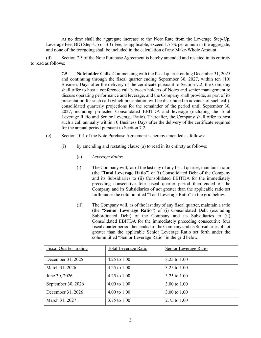 3 At no time shall the aggregate increase to the Note Rate from the Leverage Step-Up, Leverage Fee, BIG Step-Up or BIG Fee, as applicable, exceed 1.75% per annum in the aggregate, and none of the foregoing shall be included in the calculation of any Make-Whole Amount. (d) Section 7.5 of the Note Purchase Agreement is hereby amended and restated in its entirety to read as follows: 7.5 Noteholder Calls. Commencing with the fiscal quarter ending December 31, 2025 and continuing through the fiscal quarter ending September 30, 2027, within ten (10) Business Days after the delivery of the certificate pursuant to Section 7.2, the Company shall offer to host a conference call between holders of Notes and senior management to discuss operating performance and leverage, and the Company shall provide, as part of its presentation for such call (which presentation will be distributed in advance of such call), consolidated quarterly projections for the remainder of the period until September 30, 2027, including projected Consolidated EBITDA and leverage (including the Total Leverage Ratio and Senior Leverage Ratio). Thereafter, the Company shall offer to host such a call annually within 10 Business Days after the delivery of the certificate required for the annual period pursuant to Section 7.2. (e) Section 10.1 of the Note Purchase Agreement is hereby amended as follows: (i) by amending and restating clause (a) to read in its entirety as follows: (a) Leverage Ratios. (i) The Company will, as of the last day of any fiscal quarter, maintain a ratio (the “Total Leverage Ratio”) of (i) Consolidated Debt of the Company and its Subsidiaries to (ii) Consolidated EBITDA for the immediately preceding consecutive four fiscal quarter period then ended of the Company and its Subsidiaries of not greater than the applicable ratio set forth under the column titled “Total Leverage Ratio” in the grid below. (ii) The Company will, as of the last day of any fiscal quarter, maintain a ratio (the “Senior Leverage Ratio”) of (i) Consolidated Debt (excluding Subordinated Debt) of the Company and its Subsidiaries to (ii) Consolidated EBITDA for the immediately preceding consecutive four fiscal quarter period then ended of the Company and its Subsidiaries of not greater than the applicable Senior Leverage Ratio set forth under the column titled “Senior Leverage Ratio” in the grid below. Fiscal Quarter Ending Total Leverage Ratio Senior Leverage Ratio December 31, 2025 4.25 to 1.00 3.25 to 1.00 March 31, 2026 4.25 to 1.00 3.25 to 1.00 June 30, 2026 4.25 to 1.00 3.25 to 1.00 September 30, 2026 4.00 to 1.00 3.00 to 1.00 December 31, 2026 4.00 to 1.00 3.00 to 1.00 March 31, 2027 3.75 to 1.00 2.75 to 1.00