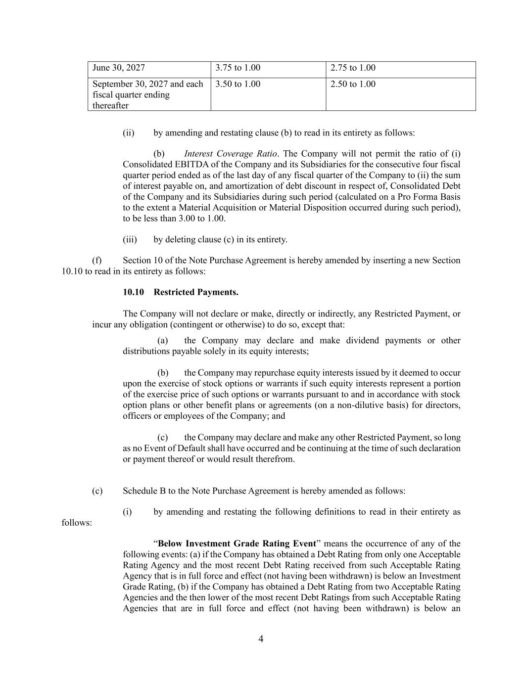 4 June 30, 2027 3.75 to 1.00 2.75 to 1.00 September 30, 2027 and each fiscal quarter ending thereafter 3.50 to 1.00 2.50 to 1.00 (ii) by amending and restating clause (b) to read in its entirety as follows: (b) Interest Coverage Ratio. The Company will not permit the ratio of (i) Consolidated EBITDA of the Company and its Subsidiaries for the consecutive four fiscal quarter period ended as of the last day of any fiscal quarter of the Company to (ii) the sum of interest payable on, and amortization of debt discount in respect of, Consolidated Debt of the Company and its Subsidiaries during such period (calculated on a Pro Forma Basis to the extent a Material Acquisition or Material Disposition occurred during such period), to be less than 3.00 to 1.00. (iii) by deleting clause (c) in its entirety. (f) Section 10 of the Note Purchase Agreement is hereby amended by inserting a new Section 10.10 to read in its entirety as follows: 10.10 Restricted Payments. The Company will not declare or make, directly or indirectly, any Restricted Payment, or incur any obligation (contingent or otherwise) to do so, except that: (a) the Company may declare and make dividend payments or other distributions payable solely in its equity interests; (b) the Company may repurchase equity interests issued by it deemed to occur upon the exercise of stock options or warrants if such equity interests represent a portion of the exercise price of such options or warrants pursuant to and in accordance with stock option plans or other benefit plans or agreements (on a non-dilutive basis) for directors, officers or employees of the Company; and (c) the Company may declare and make any other Restricted Payment, so long as no Event of Default shall have occurred and be continuing at the time of such declaration or payment thereof or would result therefrom. (c) Schedule B to the Note Purchase Agreement is hereby amended as follows: (i) by amending and restating the following definitions to read in their entirety as follows: “Below Investment Grade Rating Event” means the occurrence of any of the following events: (a) if the Company has obtained a Debt Rating from only one Acceptable Rating Agency and the most recent Debt Rating received from such Acceptable Rating Agency that is in full force and effect (not having been withdrawn) is below an Investment Grade Rating, (b) if the Company has obtained a Debt Rating from two Acceptable Rating Agencies and the then lower of the most recent Debt Ratings from such Acceptable Rating Agencies that are in full force and effect (not having been withdrawn) is below an