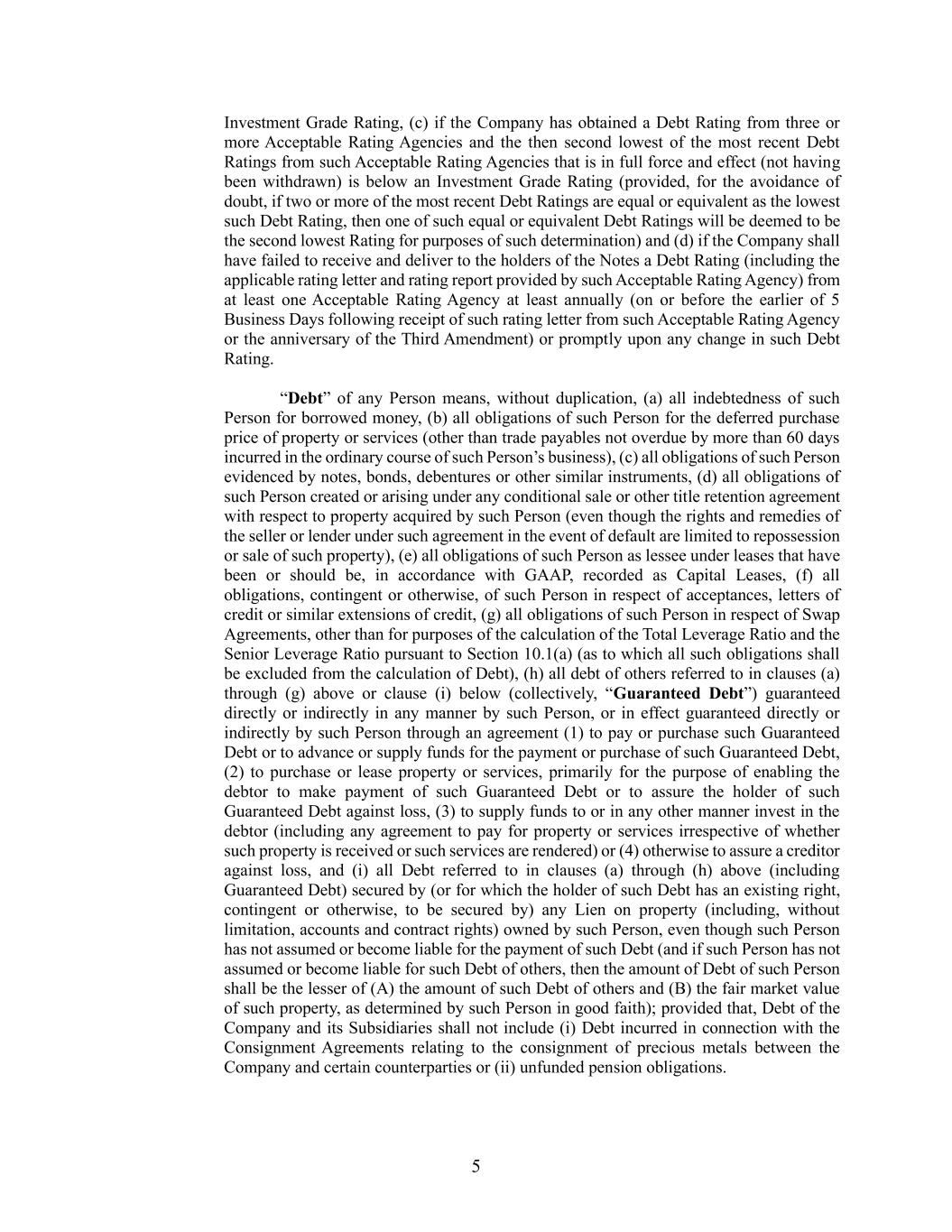 5 Investment Grade Rating, (c) if the Company has obtained a Debt Rating from three or more Acceptable Rating Agencies and the then second lowest of the most recent Debt Ratings from such Acceptable Rating Agencies that is in full force and effect (not having been withdrawn) is below an Investment Grade Rating (provided, for the avoidance of doubt, if two or more of the most recent Debt Ratings are equal or equivalent as the lowest such Debt Rating, then one of such equal or equivalent Debt Ratings will be deemed to be the second lowest Rating for purposes of such determination) and (d) if the Company shall have failed to receive and deliver to the holders of the Notes a Debt Rating (including the applicable rating letter and rating report provided by such Acceptable Rating Agency) from at least one Acceptable Rating Agency at least annually (on or before the earlier of 5 Business Days following receipt of such rating letter from such Acceptable Rating Agency or the anniversary of the Third Amendment) or promptly upon any change in such Debt Rating. “Debt” of any Person means, without duplication, (a) all indebtedness of such Person for borrowed money, (b) all obligations of such Person for the deferred purchase price of property or services (other than trade payables not overdue by more than 60 days incurred in the ordinary course of such Person’s business), (c) all obligations of such Person evidenced by notes, bonds, debentures or other similar instruments, (d) all obligations of such Person created or arising under any conditional sale or other title retention agreement with respect to property acquired by such Person (even though the rights and remedies of the seller or lender under such agreement in the event of default are limited to repossession or sale of such property), (e) all obligations of such Person as lessee under leases that have been or should be, in accordance with GAAP, recorded as Capital Leases, (f) all obligations, contingent or otherwise, of such Person in respect of acceptances, letters of credit or similar extensions of credit, (g) all obligations of such Person in respect of Swap Agreements, other than for purposes of the calculation of the Total Leverage Ratio and the Senior Leverage Ratio pursuant to Section 10.1(a) (as to which all such obligations shall be excluded from the calculation of Debt), (h) all debt of others referred to in clauses (a) through (g) above or clause (i) below (collectively, “Guaranteed Debt”) guaranteed directly or indirectly in any manner by such Person, or in effect guaranteed directly or indirectly by such Person through an agreement (1) to pay or purchase such Guaranteed Debt or to advance or supply funds for the payment or purchase of such Guaranteed Debt, (2) to purchase or lease property or services, primarily for the purpose of enabling the debtor to make payment of such Guaranteed Debt or to assure the holder of such Guaranteed Debt against loss, (3) to supply funds to or in any other manner invest in the debtor (including any agreement to pay for property or services irrespective of whether such property is received or such services are rendered) or (4) otherwise to assure a creditor against loss, and (i) all Debt referred to in clauses (a) through (h) above (including Guaranteed Debt) secured by (or for which the holder of such Debt has an existing right, contingent or otherwise, to be secured by) any Lien on property (including, without limitation, accounts and contract rights) owned by such Person, even though such Person has not assumed or become liable for the payment of such Debt (and if such Person has not assumed or become liable for such Debt of others, then the amount of Debt of such Person shall be the lesser of (A) the amount of such Debt of others and (B) the fair market value of such property, as determined by such Person in good faith); provided that, Debt of the Company and its Subsidiaries shall not include (i) Debt incurred in connection with the Consignment Agreements relating to the consignment of precious metals between the Company and certain counterparties or (ii) unfunded pension obligations.