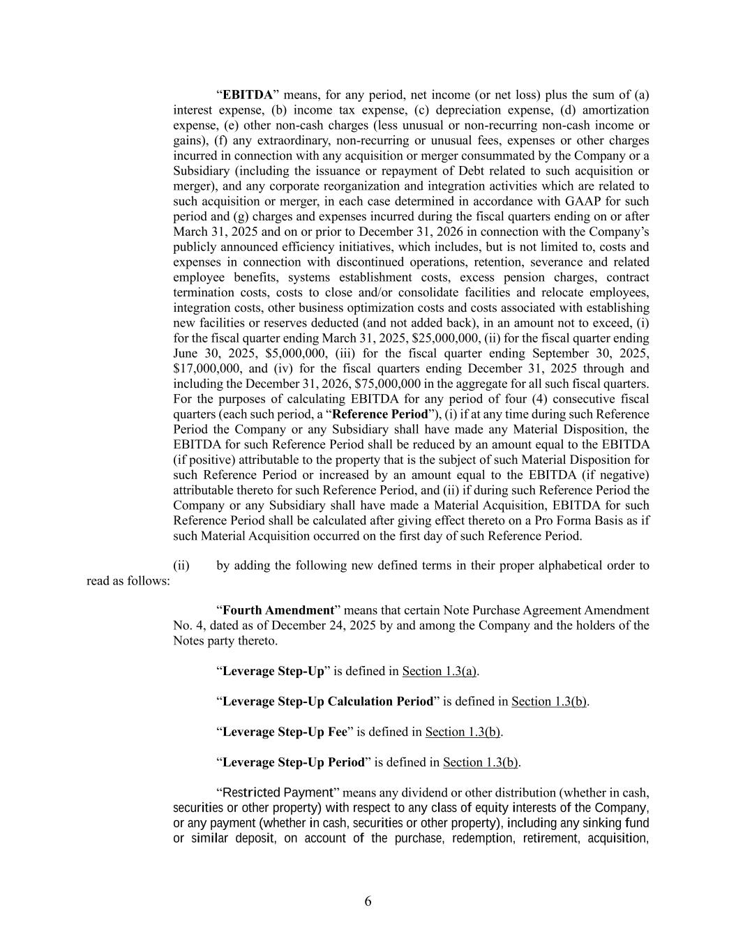 6 “EBITDA” means, for any period, net income (or net loss) plus the sum of (a) interest expense, (b) income tax expense, (c) depreciation expense, (d) amortization expense, (e) other non-cash charges (less unusual or non-recurring non-cash income or gains), (f) any extraordinary, non-recurring or unusual fees, expenses or other charges incurred in connection with any acquisition or merger consummated by the Company or a Subsidiary (including the issuance or repayment of Debt related to such acquisition or merger), and any corporate reorganization and integration activities which are related to such acquisition or merger, in each case determined in accordance with GAAP for such period and (g) charges and expenses incurred during the fiscal quarters ending on or after March 31, 2025 and on or prior to December 31, 2026 in connection with the Company’s publicly announced efficiency initiatives, which includes, but is not limited to, costs and expenses in connection with discontinued operations, retention, severance and related employee benefits, systems establishment costs, excess pension charges, contract termination costs, costs to close and/or consolidate facilities and relocate employees, integration costs, other business optimization costs and costs associated with establishing new facilities or reserves deducted (and not added back), in an amount not to exceed, (i) for the fiscal quarter ending March 31, 2025, $25,000,000, (ii) for the fiscal quarter ending June 30, 2025, $5,000,000, (iii) for the fiscal quarter ending September 30, 2025, $17,000,000, and (iv) for the fiscal quarters ending December 31, 2025 through and including the December 31, 2026, $75,000,000 in the aggregate for all such fiscal quarters. For the purposes of calculating EBITDA for any period of four (4) consecutive fiscal quarters (each such period, a “Reference Period”), (i) if at any time during such Reference Period the Company or any Subsidiary shall have made any Material Disposition, the EBITDA for such Reference Period shall be reduced by an amount equal to the EBITDA (if positive) attributable to the property that is the subject of such Material Disposition for such Reference Period or increased by an amount equal to the EBITDA (if negative) attributable thereto for such Reference Period, and (ii) if during such Reference Period the Company or any Subsidiary shall have made a Material Acquisition, EBITDA for such Reference Period shall be calculated after giving effect thereto on a Pro Forma Basis as if such Material Acquisition occurred on the first day of such Reference Period. (ii) by adding the following new defined terms in their proper alphabetical order to read as follows: “Fourth Amendment” means that certain Note Purchase Agreement Amendment No. 4, dated as of December 24, 2025 by and among the Company and the holders of the Notes party thereto. “Leverage Step-Up” is defined in Section 1.3(a). “Leverage Step-Up Calculation Period” is defined in Section 1.3(b). “Leverage Step-Up Fee” is defined in Section 1.3(b). “Leverage Step-Up Period” is defined in Section 1.3(b). “Restricted Payment” means any dividend or other distribution (whether in cash, securities or other property) with respect to any class of equity interests of the Company, or any payment (whether in cash, securities or other property), including any sinking fund or similar deposit, on account of the purchase, redemption, retirement, acquisition,