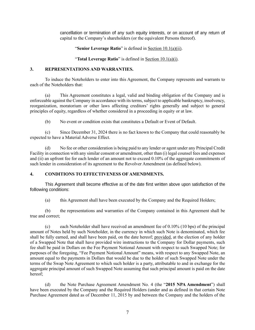7 cancellation or termination of any such equity interests, or on account of any return of capital to the Company’s shareholders (or the equivalent Persons thereof). “Senior Leverage Ratio” is defined in Section 10.1(a)(ii). “Total Leverage Ratio” is defined in Section 10.1(a)(i). 3. REPRESENTATIONS AND WARRANTIES. To induce the Noteholders to enter into this Agreement, the Company represents and warrants to each of the Noteholders that: (a) This Agreement constitutes a legal, valid and binding obligation of the Company and is enforceable against the Company in accordance with its terms, subject to applicable bankruptcy, insolvency, reorganization, moratorium or other laws affecting creditors’ rights generally and subject to general principles of equity, regardless of whether considered in a proceeding in equity or at law. (b) No event or condition exists that constitutes a Default or Event of Default. (c) Since December 31, 2024 there is no fact known to the Company that could reasonably be expected to have a Material Adverse Effect. (d) No fee or other consideration is being paid to any lender or agent under any Principal Credit Facility in connection with any similar consent or amendment, other than (i) legal counsel fees and expenses and (ii) an upfront fee for each lender of an amount not to exceed 0.10% of the aggregate commitments of such lender in consideration of its agreement to the Revolver Amendment (as defined below). 4. CONDITIONS TO EFFECTIVENESS OF AMENDMENTS. This Agreement shall become effective as of the date first written above upon satisfaction of the following conditions: (a) this Agreement shall have been executed by the Company and the Required Holders; (b) the representations and warranties of the Company contained in this Agreement shall be true and correct; (c) each Noteholder shall have received an amendment fee of 0.10% (10 bps) of the principal amount of Notes held by such Noteholder, in the currency in which such Note is denominated, which fee shall be fully earned, and shall have been paid, on the date hereof; provided, at the election of any holder of a Swapped Note that shall have provided wire instructions to the Company for Dollar payments, such fee shall be paid in Dollars on the Fee Payment Notional Amount with respect to such Swapped Note; for purposes of the foregoing, “Fee Payment Notional Amount” means, with respect to any Swapped Note, an amount equal to the payments in Dollars that would be due to the holder of such Swapped Note under the terms of the Swap Note Agreement to which such holder is a party, attributable to and in exchange for the aggregate principal amount of such Swapped Note assuming that such principal amount is paid on the date hereof; (d) the Note Purchase Agreement Amendment No. 4 (the “2015 NPA Amendment”) shall have been executed by the Company and the Required Holders (under and as defined in that certain Note Purchase Agreement dated as of December 11, 2015 by and between the Company and the holders of the