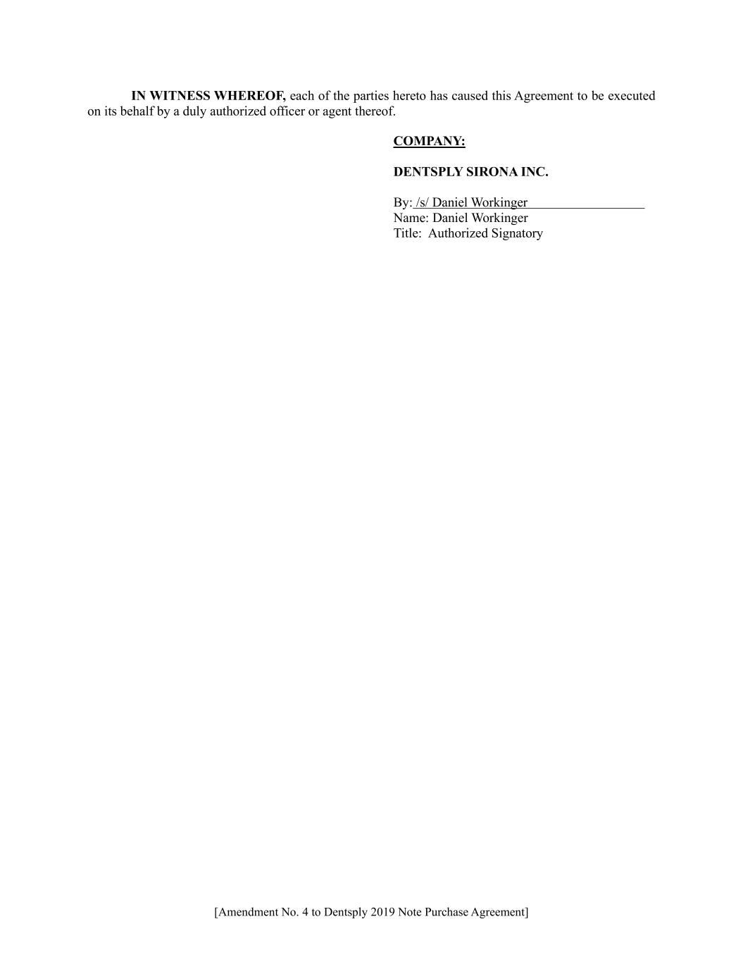 [Amendment No. 4 to Dentsply 2019 Note Purchase Agreement] IN WITNESS WHEREOF, each of the parties hereto has caused this Agreement to be executed on its behalf by a duly authorized officer or agent thereof. COMPANY: DENTSPLY SIRONA INC. By: /s/ Daniel Workinger Name: Daniel Workinger Title: Authorized Signatory