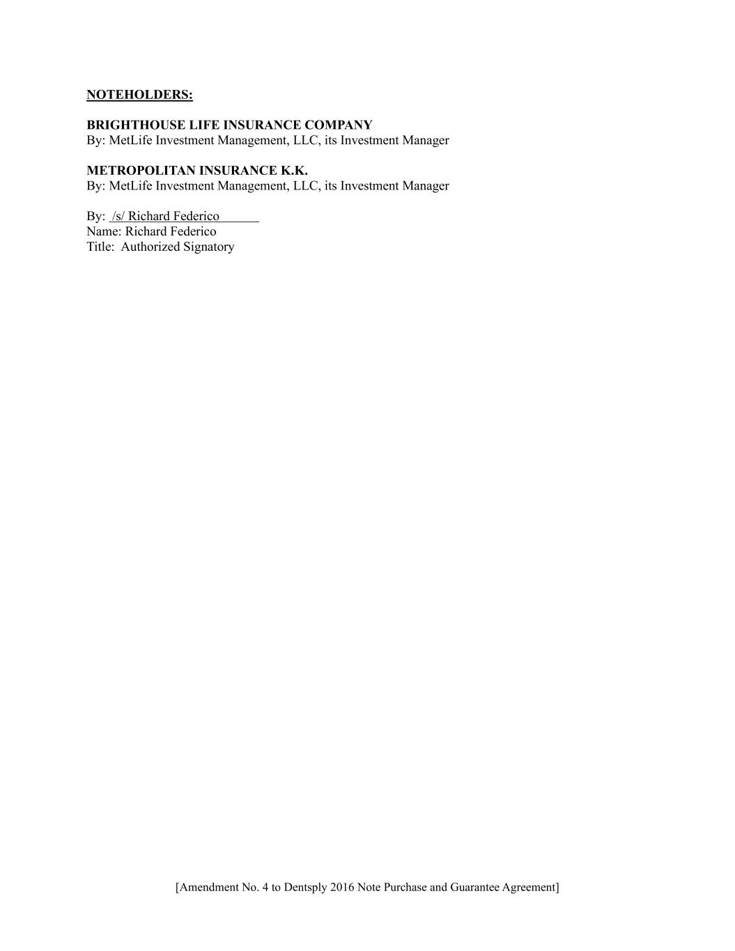 [Amendment No. 4 to Dentsply 2016 Note Purchase and Guarantee Agreement] NOTEHOLDERS: BRIGHTHOUSE LIFE INSURANCE COMPANY By: MetLife Investment Management, LLC, its Investment Manager METROPOLITAN INSURANCE K.K. By: MetLife Investment Management, LLC, its Investment Manager By: /s/ Richard Federico Name: Richard Federico Title: Authorized Signatory
