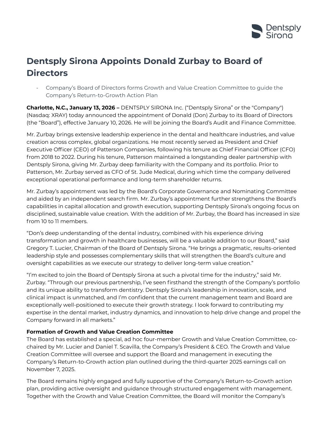 Dentsply Sirona Appoints Donald Zurbay to Board of Directors - Company’s Board of Directors forms Growth and Value Creation Committee to guide the Company’s Return-to-Growth Action Plan Charlotte, N.C., January 13, 2026 – DENTSPLY SIRONA Inc. (“Dentsply Sirona” or the "Company") (Nasdaq: XRAY) today announced the appointment of Donald (Don) Zurbay to its Board of Directors (the “Board”), effective January 10, 2026. He will be joining the Board’s Audit and Finance Committee. Mr. Zurbay brings extensive leadership experience in the dental and healthcare industries, and value creation across complex, global organizations. He most recently served as President and Chief Executive Officer (CEO) of Patterson Companies, following his tenure as Chief Financial Officer (CFO) from 2018 to 2022. During his tenure, Patterson maintained a longstanding dealer partnership with Dentsply Sirona, giving Mr. Zurbay deep familiarity with the Company and its portfolio. Prior to Patterson, Mr. Zurbay served as CFO of St. Jude Medical, during which time the company delivered exceptional operational performance and long-term shareholder returns. Mr. Zurbay’s appointment was led by the Board’s Corporate Governance and Nominating Committee and aided by an independent search firm. Mr. Zurbay’s appointment further strengthens the Board’s capabilities in capital allocation and growth execution, supporting Dentsply Sirona’s ongoing focus on disciplined, sustainable value creation. With the addition of Mr. Zurbay, the Board has increased in size from 10 to 11 members. “Don’s deep understanding of the dental industry, combined with his experience driving transformation and growth in healthcare businesses, will be a valuable addition to our Board,” said Gregory T. Lucier, Chairman of the Board of Dentsply Sirona. “He brings a pragmatic, results-oriented leadership style and possesses complementary skills that will strengthen the Board’s culture and oversight capabilities as we execute our strategy to deliver long-term value creation.” “I’m excited to join the Board of Dentsply Sirona at such a pivotal time for the industry,” said Mr. Zurbay. “Through our previous partnership, I’ve seen firsthand the strength of the Company’s portfolio and its unique ability to transform dentistry. Dentsply Sirona’s leadership in innovation, scale, and clinical impact is unmatched, and I’m confident that the current management team and Board are exceptionally well-positioned to execute their growth strategy. I look forward to contributing my expertise in the dental market, industry dynamics, and innovation to help drive change and propel the Company forward in all markets.” Formation of Growth and Value Creation Committee The Board has established a special, ad hoc four-member Growth and Value Creation Committee, co- chaired by Mr. Lucier and Daniel T. Scavilla, the Company’s President & CEO. The Growth and Value Creation Committee will oversee and support the Board and management in executing the Company’s Return-to-Growth action plan outlined during the third-quarter 2025 earnings call on November 7, 2025. The Board remains highly engaged and fully supportive of the Company’s Return-to-Growth action plan, providing active oversight and guidance through structured engagement with management. Together with the Growth and Value Creation Committee, the Board will monitor the Company’s