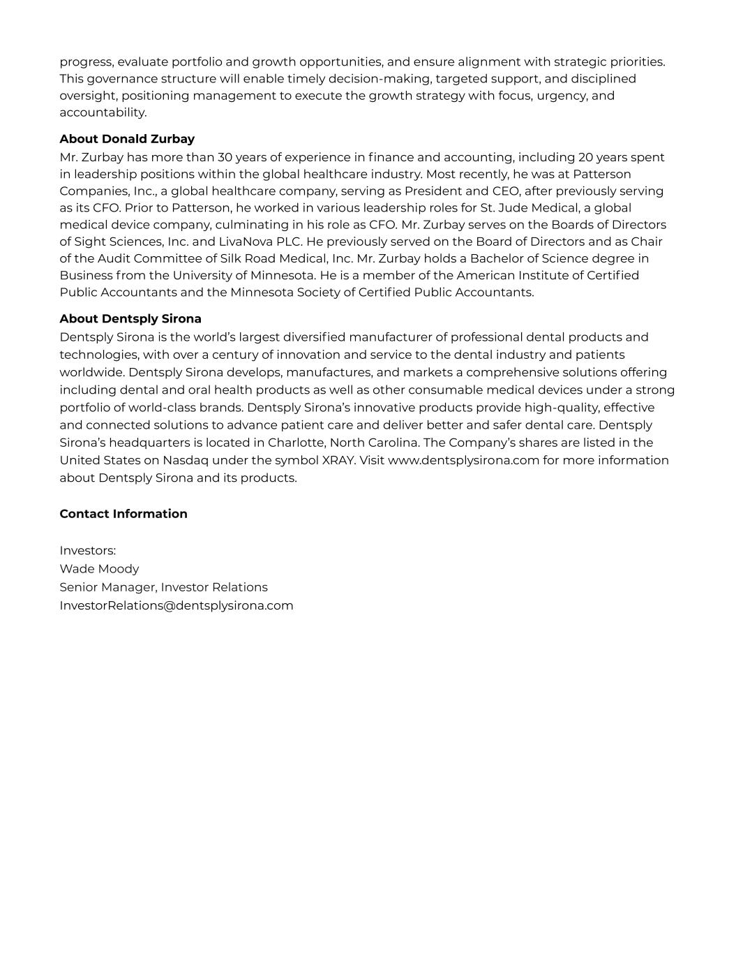 progress, evaluate portfolio and growth opportunities, and ensure alignment with strategic priorities. This governance structure will enable timely decision-making, targeted support, and disciplined oversight, positioning management to execute the growth strategy with focus, urgency, and accountability. About Donald Zurbay Mr. Zurbay has more than 30 years of experience in finance and accounting, including 20 years spent in leadership positions within the global healthcare industry. Most recently, he was at Patterson Companies, Inc., a global healthcare company, serving as President and CEO, after previously serving as its CFO. Prior to Patterson, he worked in various leadership roles for St. Jude Medical, a global medical device company, culminating in his role as CFO. Mr. Zurbay serves on the Boards of Directors of Sight Sciences, Inc. and LivaNova PLC. He previously served on the Board of Directors and as Chair of the Audit Committee of Silk Road Medical, Inc. Mr. Zurbay holds a Bachelor of Science degree in Business from the University of Minnesota. He is a member of the American Institute of Certif ied Public Accountants and the Minnesota Society of Certified Public Accountants. About Dentsply Sirona Dentsply Sirona is the world’s largest diversified manufacturer of professional dental products and technologies, with over a century of innovation and service to the dental industry and patients worldwide. Dentsply Sirona develops, manufactures, and markets a comprehensive solutions offering including dental and oral health products as well as other consumable medical devices under a strong portfolio of world-class brands. Dentsply Sirona’s innovative products provide high-quality, effective and connected solutions to advance patient care and deliver better and safer dental care. Dentsply Sirona’s headquarters is located in Charlotte, North Carolina. The Company’s shares are listed in the United States on Nasdaq under the symbol XRAY. Visit www.dentsplysirona.com for more information about Dentsply Sirona and its products. Contact Information Investors: Wade Moody Senior Manager, Investor Relations InvestorRelations@dentsplysirona.com