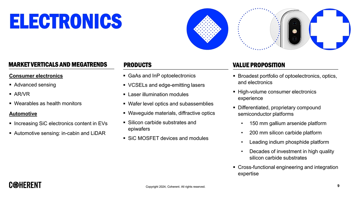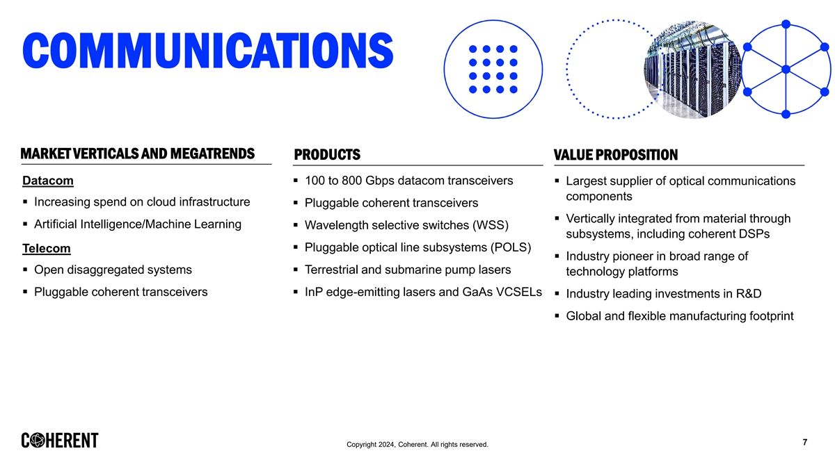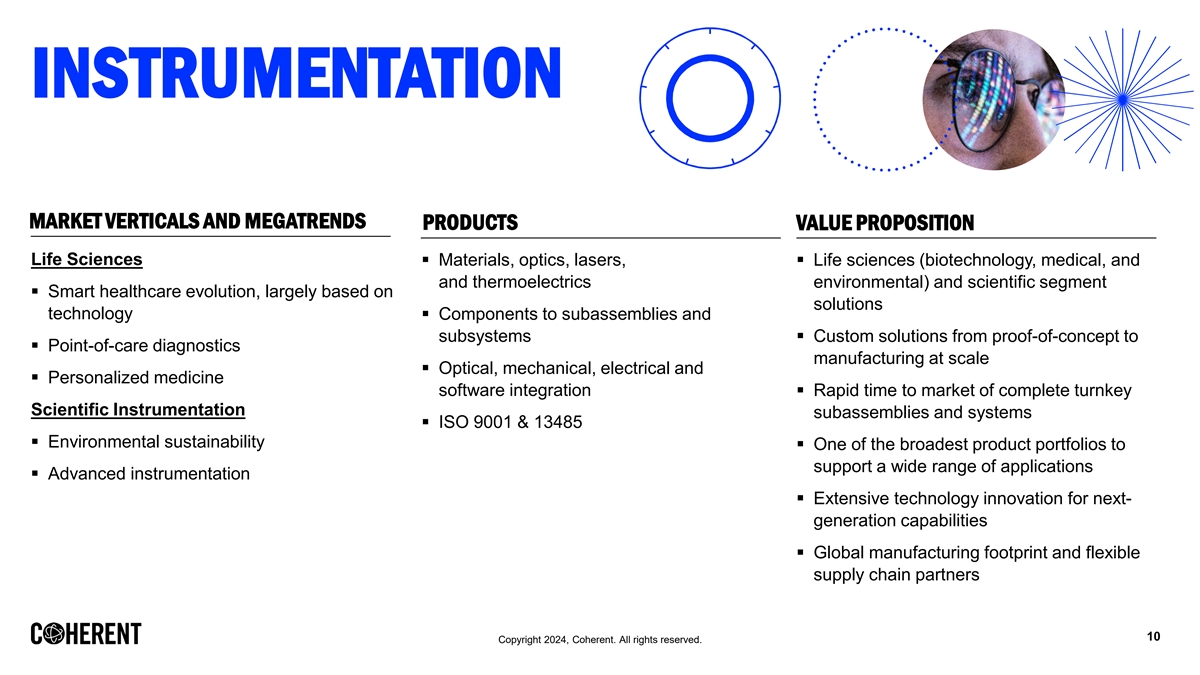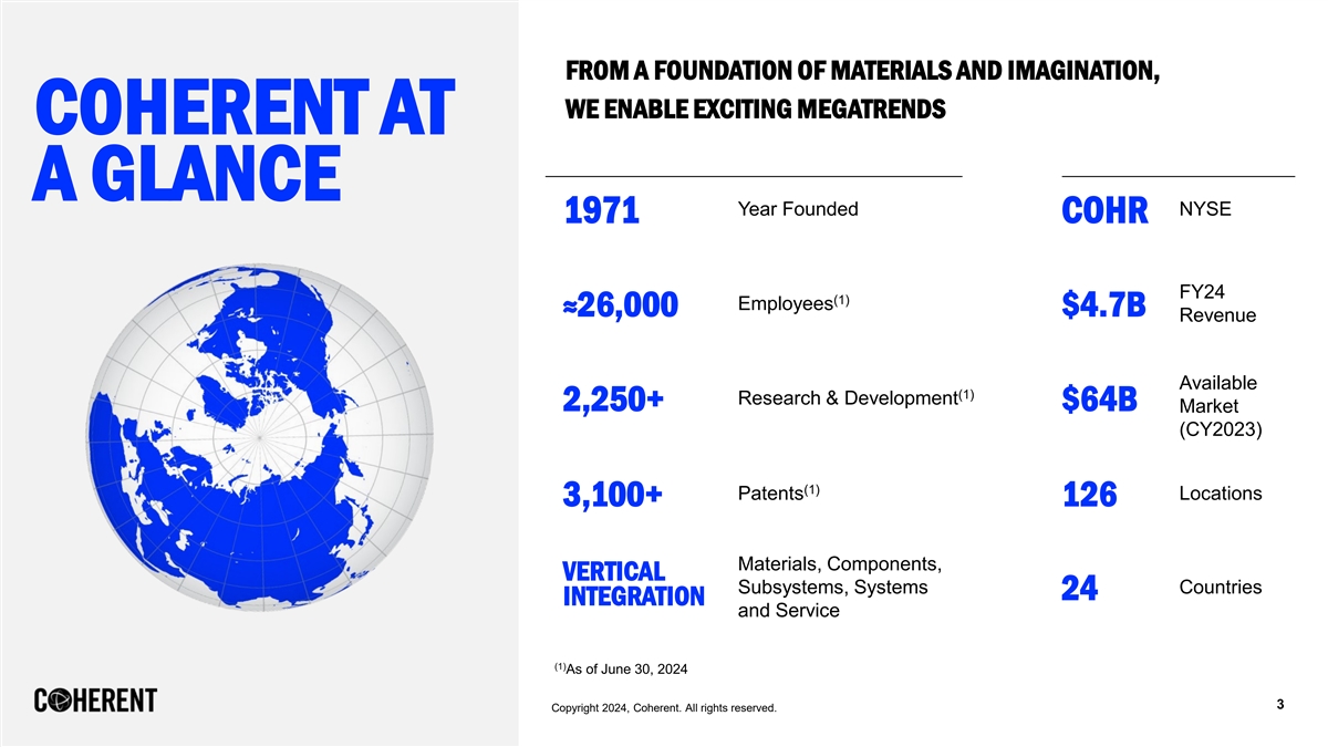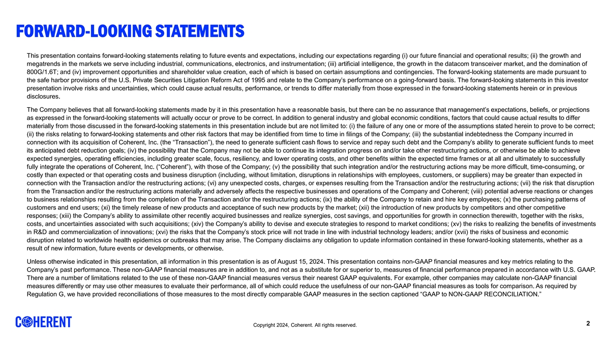 FORWARD-LOOKING STATEMENTS This presentation contains forward-looking statements relating to future events and expectations, including our expectations regarding (i) our future financial and operational results; (ii) the growth and megatrends in the markets we serve including industrial, communications, electronics, and instrumentation; (iii) artificial intelligence, the growth in the datacom transceiver market, and the domination of 800G/1.6T; and (iv) improvement opportunities and shareholder value creation, each of which is based on certain assumptions and contingencies. The forward-looking statements are made pursuant to the safe harbor provisions of the U.S. Private Securities Litigation Reform Act of 1995 and relate to the Company’s performance on a going-forward basis. The forward-looking statements in this investor presentation involve risks and uncertainties, which could cause actual results, performance, or trends to differ materially from those expressed in the forward-looking statements herein or in previous disclosures. The Company believes that all forward-looking statements made by it in this presentation have a reasonable basis, but there can be no assurance that management’s expectations, beliefs, or projections as expressed in the forward-looking statements will actually occur or prove to be correct. In addition to general industry and global economic conditions, factors that could cause actual results to differ materially from those discussed in the forward-looking statements in this presentation include but are not limited to: (i) the failure of any one or more of the assumptions stated herein to prove to be correct; (ii) the risks relating to forward-looking statements and other risk factors that may be identified from time to time in filings of the Company; (iii) the substantial indebtedness the Company incurred in connection with its acquisition of Coherent, Inc. (the “Transaction”), the need to generate sufficient cash flows to service and repay such debt and the Company’s ability to generate sufficient funds to meet its anticipated debt reduction goals; (iv) the possibility that the Company may not be able to continue its integration progress on and/or take other restructuring actions, or otherwise be able to achieve expected synergies, operating efficiencies, including greater scale, focus, resiliency, and lower operating costs, and other benefits within the expected time frames or at all and ultimately to successfully fully integrate the operations of Coherent, Inc. (“Coherent”), with those of the Company; (v) the possibility that such integration and/or the restructuring actions may be more difficult, time-consuming, or costly than expected or that operating costs and business disruption (including, without limitation, disruptions in relationships with employees, customers, or suppliers) may be greater than expected in connection with the Transaction and/or the restructuring actions; (vi) any unexpected costs, charges, or expenses resulting from the Transaction and/or the restructuring actions; (vii) the risk that disruption from the Transaction and/or the restructuring actions materially and adversely affects the respective businesses and operations of the Company and Coherent; (viii) potential adverse reactions or changes to business relationships resulting from the completion of the Transaction and/or the restructuring actions; (ix) the ability of the Company to retain and hire key employees; (x) the purchasing patterns of customers and end users; (xi) the timely release of new products and acceptance of such new products by the market; (xii) the introduction of new products by competitors and other competitive responses; (xiii) the Company’s ability to assimilate other recently acquired businesses and realize synergies, cost savings, and opportunities for growth in connection therewith, together with the risks, costs, and uncertainties associated with such acquisitions; (xiv) the Company’s ability to devise and execute strategies to respond to market conditions; (xv) the risks to realizing the benefits of investments in R&D and commercialization of innovations; (xvi) the risks that the Company’s stock price will not trade in line with industrial technology leaders; and/or (xvii) the risks of business and economic disruption related to worldwide health epidemics or outbreaks that may arise. The Company disclaims any obligation to update information contained in these forward-looking statements, whether as a result of new information, future events or developments, or otherwise. Unless otherwise indicated in this presentation, all information in this presentation is as of August 15, 2024. This presentation contains non-GAAP financial measures and key metrics relating to the Company’s past performance. These non-GAAP financial measures are in addition to, and not as a substitute for or superior to, measures of financial performance prepared in accordance with U.S. GAAP. There are a number of limitations related to the use of these non-GAAP financial measures versus their nearest GAAP equivalents. For example, other companies may calculate non-GAAP financial measures differently or may use other measures to evaluate their performance, all of which could reduce the usefulness of our non-GAAP financial measures as tools for comparison. As required by Regulation G, we have provided reconciliations of those measures to the most directly comparable GAAP measures in the section captioned “GAAP to NON-GAAP RECONCILIATION.” 2 Copyright 2024, Coherent. All rights reserved.