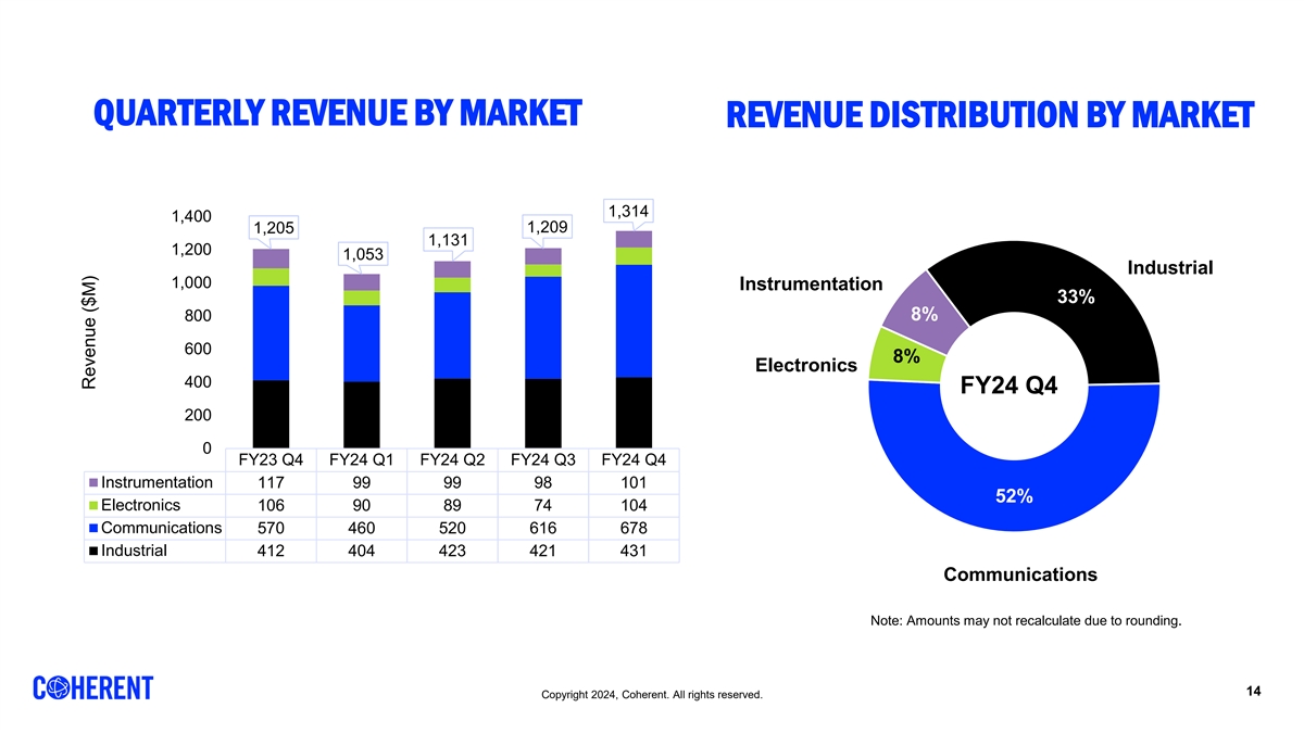 QUARTERLY REVENUE BY SEGMENT REVENUE DISTRIBUTION BY SEGMENT (1) Revenue Distribution Quarterly Revenue by Segment 1,314 1,400 1,205 1,209 1,131 1,200 1,053 27% 1,000 Lasers Materials 21% 800 600 FY24 Q4 400 200 0 52% FY23 Q4 FY24 Q1 FY24 Q2 FY24 Q3 FY24Q4 Lasers 333 336 354 351 355 Networking 585 473 524 619 680 Networking Materials 288 245 254 239 279 Note: Amounts may not recalculate due to rounding. 13 Copyright 2024, Coherent. All rights reserved. Revenue ($M)