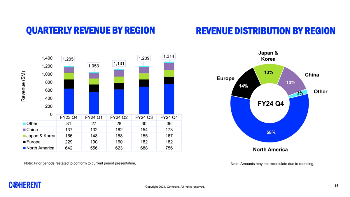 QUARTERLY REVENUE BY MARKET REVENUE DISTRIBUTION BY MARKET (1) Quarterly Revenue Trend Revenue Distribution 1,314 1,400 1,209 1,205 1,131 1,200 1,053 Industrial 1,000 Instrumentation 33% 8% 800 600 8% Electronics 400 FY24 Q4 200 0 FY23 Q4 FY24 Q1 FY24 Q2 FY24 Q3 FY24 Q4 Instrumentation 117 99 99 98 101 52% Electronics 106 90 89 74 104 Communications 570 460 520 616 678 Industrial 412 404 423 421 431 Communications Note: Amounts may not recalculate due to rounding. 14 Copyright 2024, Coherent. All rights reserved. Revenue ($M)