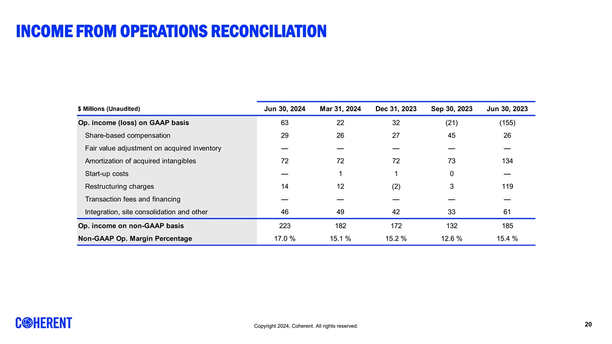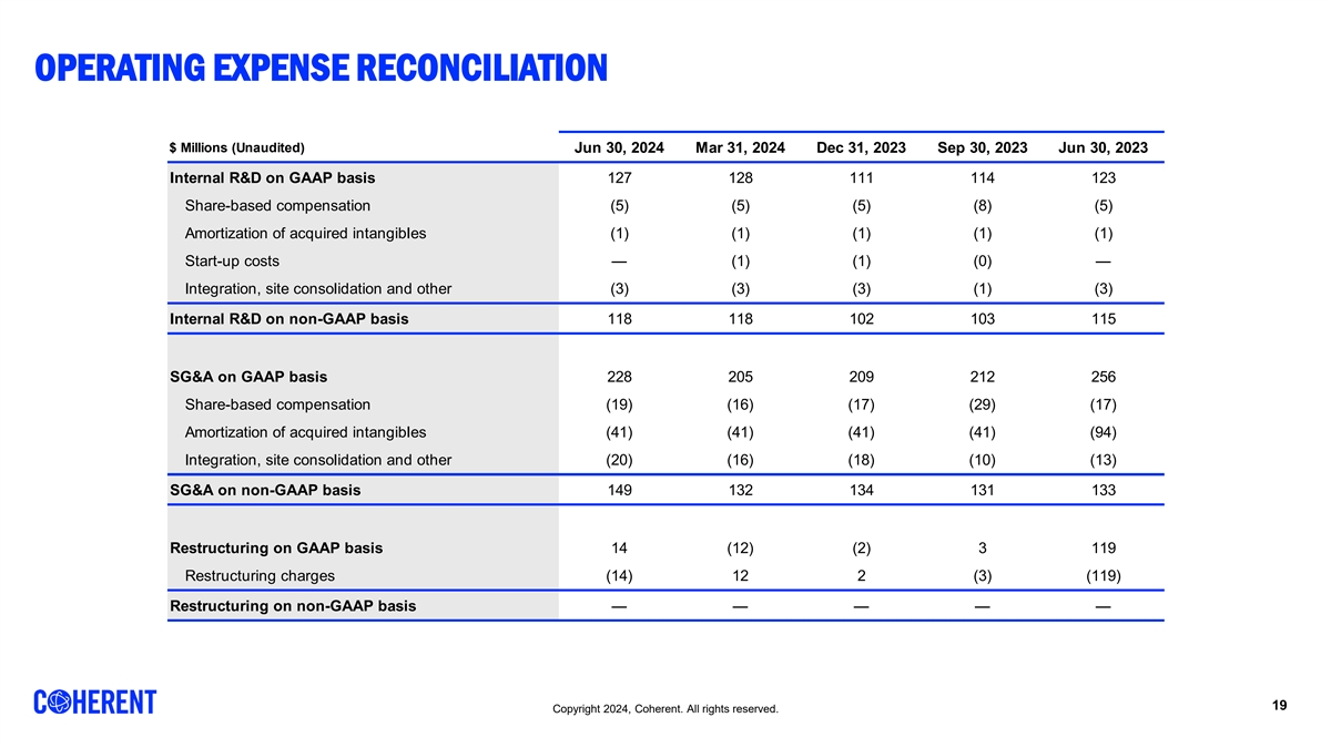 OPERATING EXPENSE RECONCILIATION $ Millions (Unaudited) Jun 30, 2024 Mar 31, 2024 Dec 31, 2023 Sep 30, 2023 Jun 30, 2023 Internal R&D on GAAP basis 127 128 111 114 123 Share-based compensation (5) (5) (5) (8) (5) Amortization of acquired intangibles (1) (1) (1) (1) (1) Start-up costs — (1) (1) (0) — Integration, site consolidation and other (3) (3) (3) (1) (3) Internal R&D on non-GAAP basis 118 118 102 103 115 SG&A on GAAP basis 228 205 209 212 256 Share-based compensation (19) (16) (17) (29) (17) Amortization of acquired intangibles (41) (41) (41) (41) (94) Integration, site consolidation and other (20) (16) (18) (10) (13) SG&A on non-GAAP basis 149 132 134 131 133 Restructuring on GAAP basis 14 (12) (2) 3 119 Restructuring charges (14) 12 2 (3) (119) Restructuring on non-GAAP basis — — — — — 19 Copyright 2024, Coherent. All rights reserved.