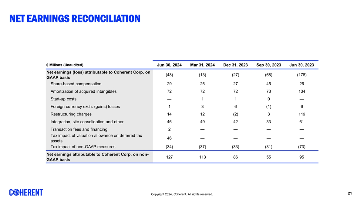 INCOME FROM OPERATIONS RECONCILIATION $ Millions (Unaudited) Jun 30, 2024 Mar 31, 2024 Dec 31, 2023 Sep 30, 2023 Jun 30, 2023 Op. income (loss) on GAAP basis 63 22 32 (21) (155) Share-based compensation 29 26 27 45 26 Fair value adjustment on acquired inventory — — — — — Amortization of acquired intangibles 72 72 72 73 134 Start-up costs — 1 1 0 — Restructuring charges 14 12 (2) 3 119 Transaction fees and financing — — — — — Integration, site consolidation and other 46 49 42 33 61 Op. income on non-GAAP basis 223 182 172 132 185 Non-GAAP Op. Margin Percentage 17.0 % 15.1 % 15.2 % 12.6 % 15.4 % 20 Copyright 2024, Coherent. All rights reserved.