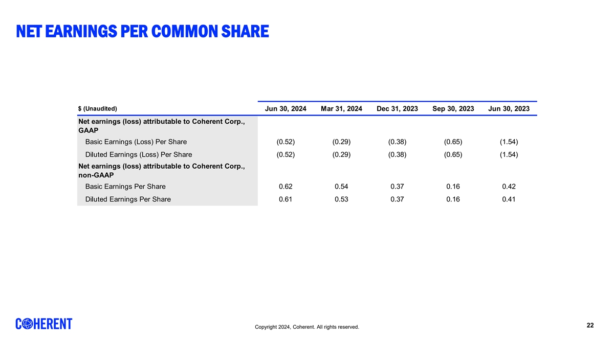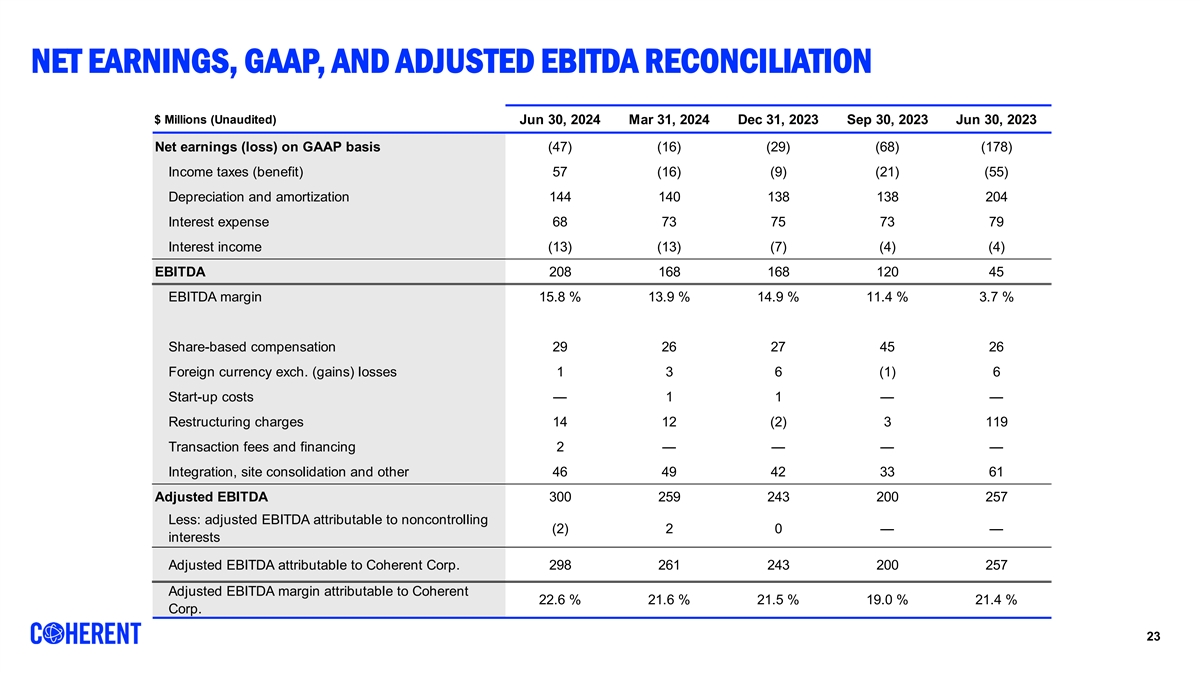 NET EARNINGS PER COMMON SHARE $ (Unaudited) Jun 30, 2024 Mar 31, 2024 Dec 31, 2023 Sep 30, 2023 Jun 30, 2023 Net earnings (loss) attributable to Coherent Corp., GAAP Basic Earnings (Loss) Per Share (0.52) (0.29) (0.38) (0.65) (1.54) Diluted Earnings (Loss) Per Share (0.52) (0.29) (0.38) (0.65) (1.54) Net earnings (loss) attributable to Coherent Corp., non-GAAP Basic Earnings Per Share 0.62 0.54 0.37 0.16 0.42 Diluted Earnings Per Share 0.61 0.53 0.37 0.16 0.41 22 Copyright 2024, Coherent. All rights reserved.
