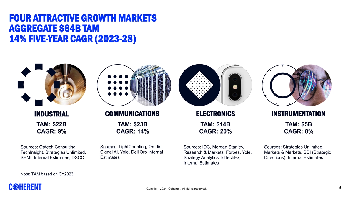 $4.7 BILLION OF REVENUE IN FY24 WELL DIVERSIFIED ACROSS TECHNOLOGY, PRODUCTS, AND GEOGRAPHIC MARKETS Segments Markets Regions North Communications Materials Europe America Industrial Lasers 15% 22% 29% 36% 48% China BY REPORTING (1) 13% BY MARKET BY REGION 56% SEGMENT 13% 8% Korea & Japan 3% 49% 8% Instrumentation Other Networking Electronics (1) Revenue by region is based on customer headquarter addresses. (2) Amounts may not recalculate due to rounding. 4 Copyright 2024, Coherent. All rights reserved.