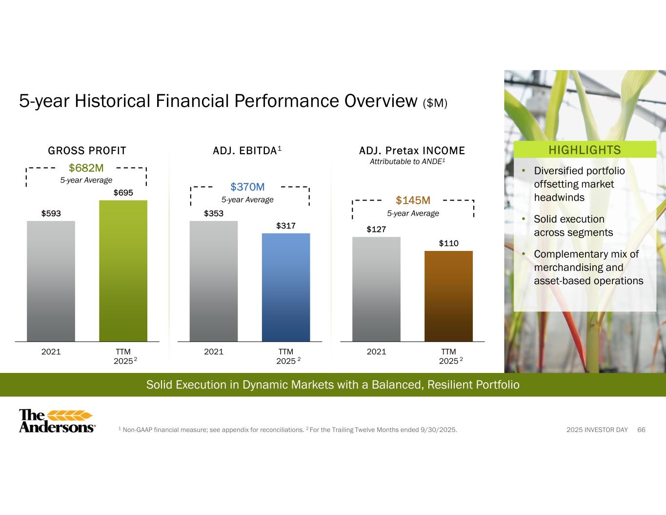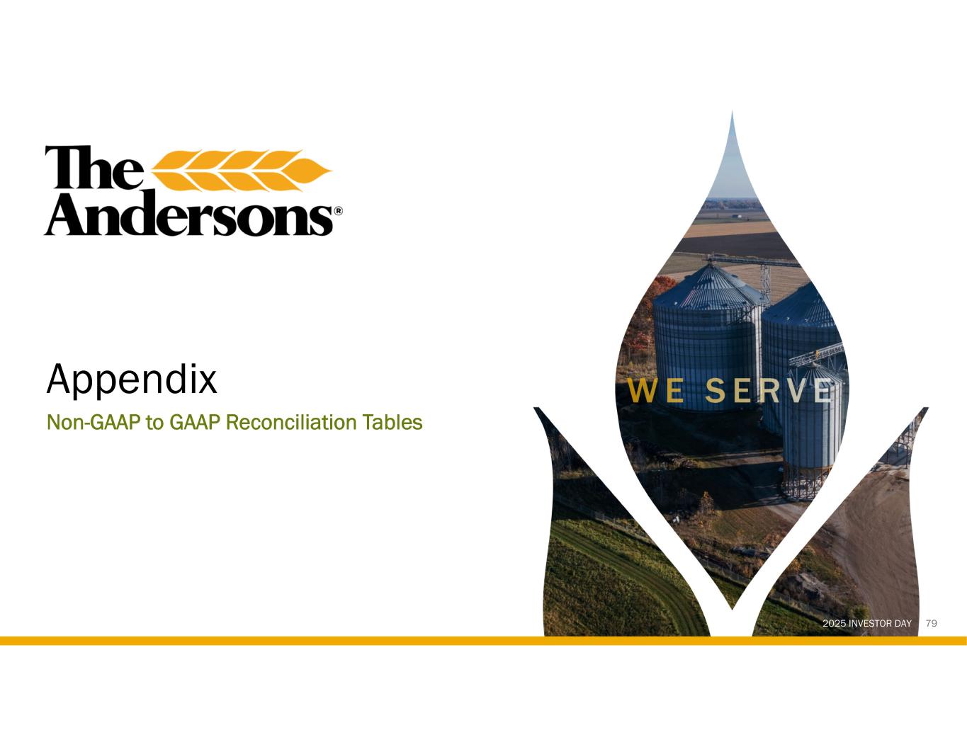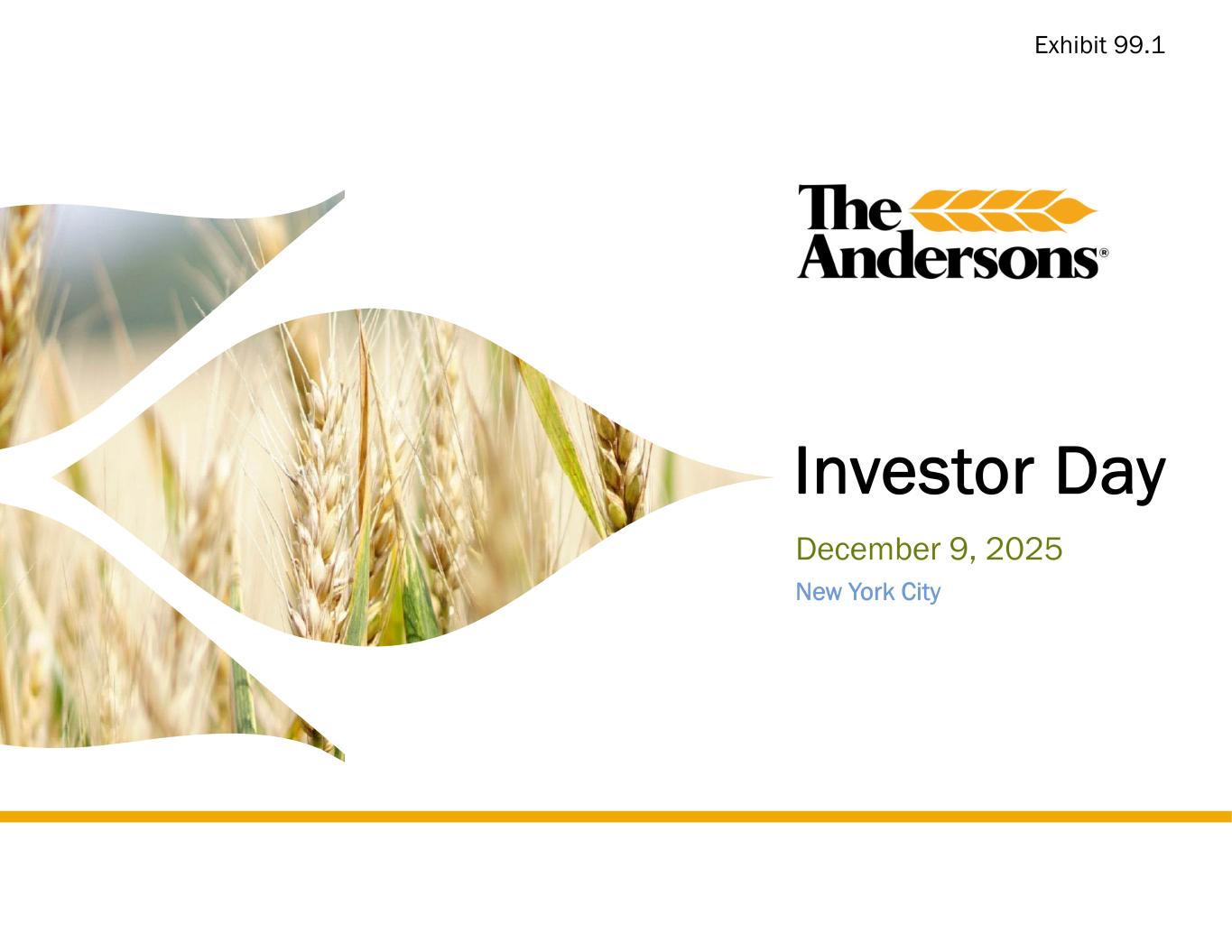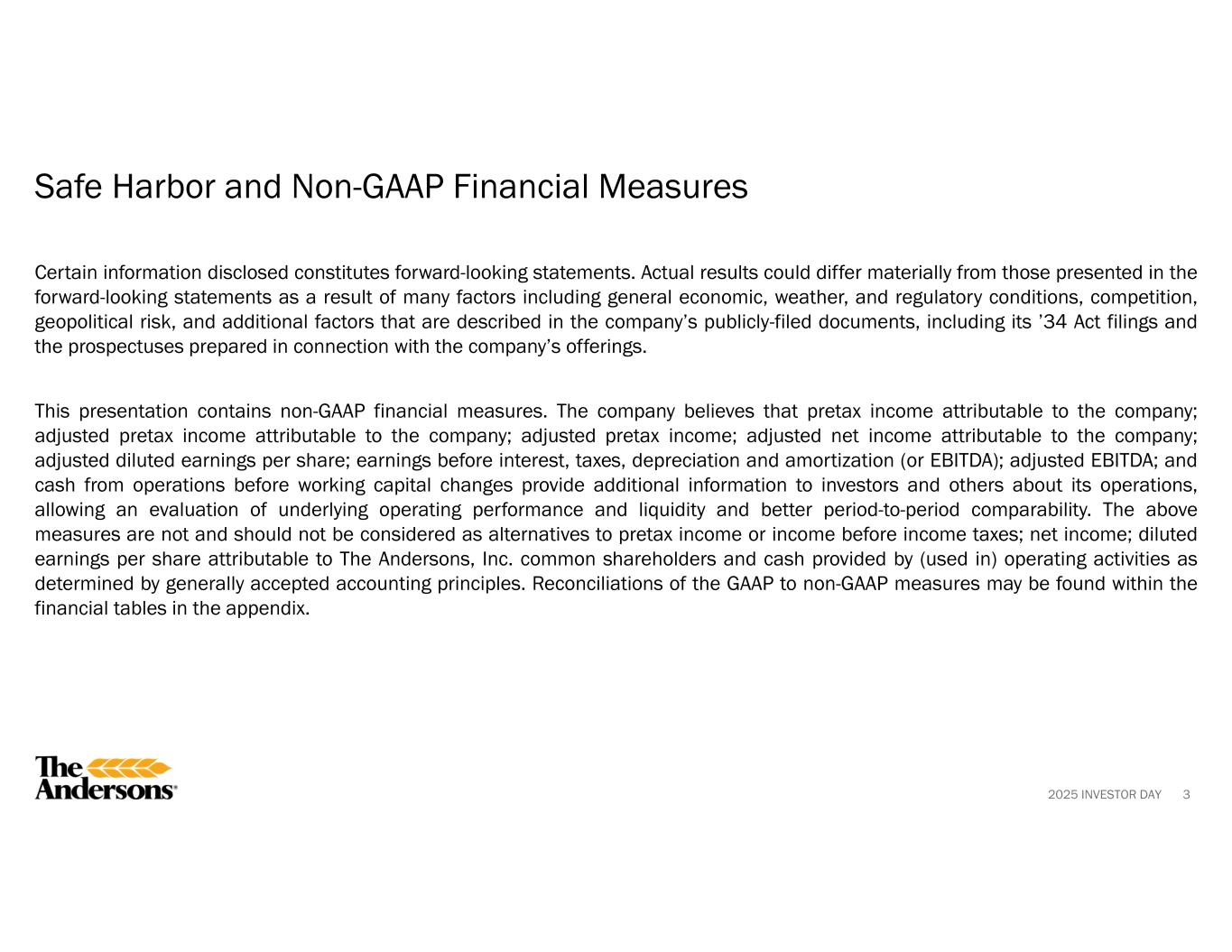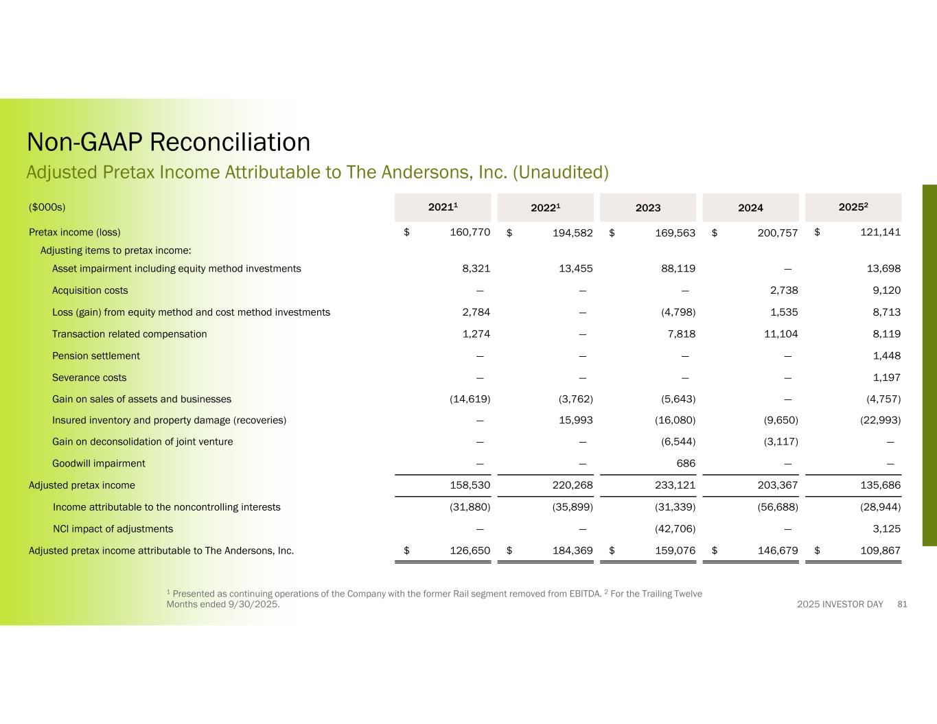 2025 INVESTOR DAY 1 Presented as continuing operations of the Company with the former Rail segment removed from EBITDA. 2 For the Trailing Twelve Months ended 9/30/2025. Non-GAAP Reconciliation Adjusted Pretax Income Attributable to The Andersons, Inc. (Unaudited) 20252202420232022120211($000s) $ 121,141$ 200,757$ 169,563$ 194,582$ 160,770Pretax income (loss) Adjusting items to pretax income: 13,698—88,11913,4558,321Asset impairment including equity method investments 9,1202,738———Acquisition costs 8,7131,535(4,798)—2,784Loss (gain) from equity method and cost method investments 8,11911,1047,818—1,274Transaction related compensation 1,448————Pension settlement 1,197————Severance costs (4,757)—(5,643)(3,762)(14,619)Gain on sales of assets and businesses (22,993)(9,650)(16,080)15,993—Insured inventory and property damage (recoveries) —(3,117)(6,544)——Gain on deconsolidation of joint venture ——686——Goodwill impairment 135,686203,367233,121220,268158,530Adjusted pretax income (28,944)(56,688)(31,339)(35,899)(31,880)Income attributable to the noncontrolling interests 3,125—(42,706)——NCI impact of adjustments $ 109,867$ 146,679$ 159,076$ 184,369$ 126,650Adjusted pretax income attributable to The Andersons, Inc. 81