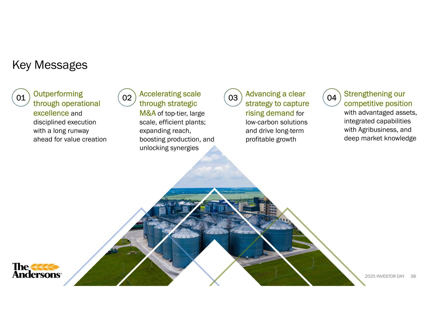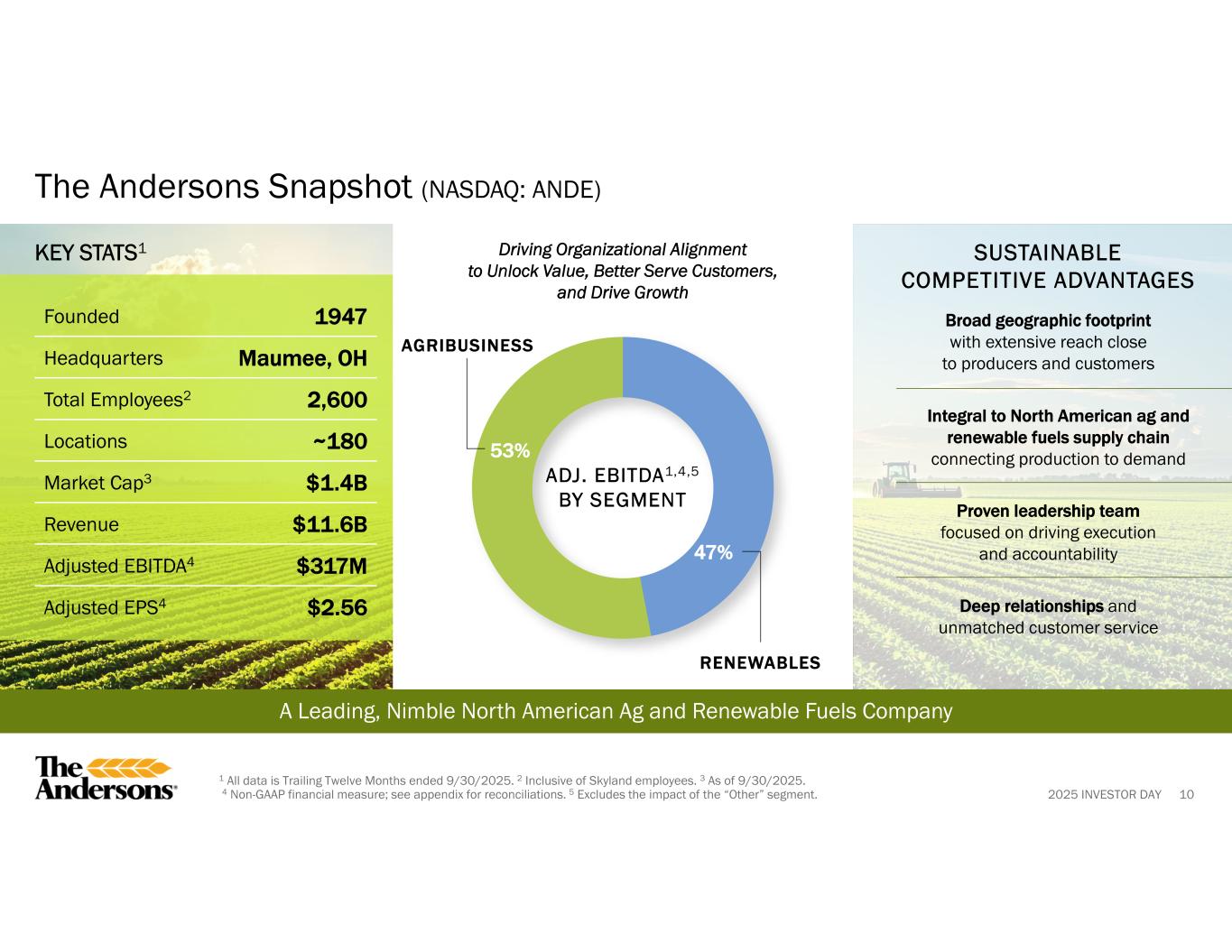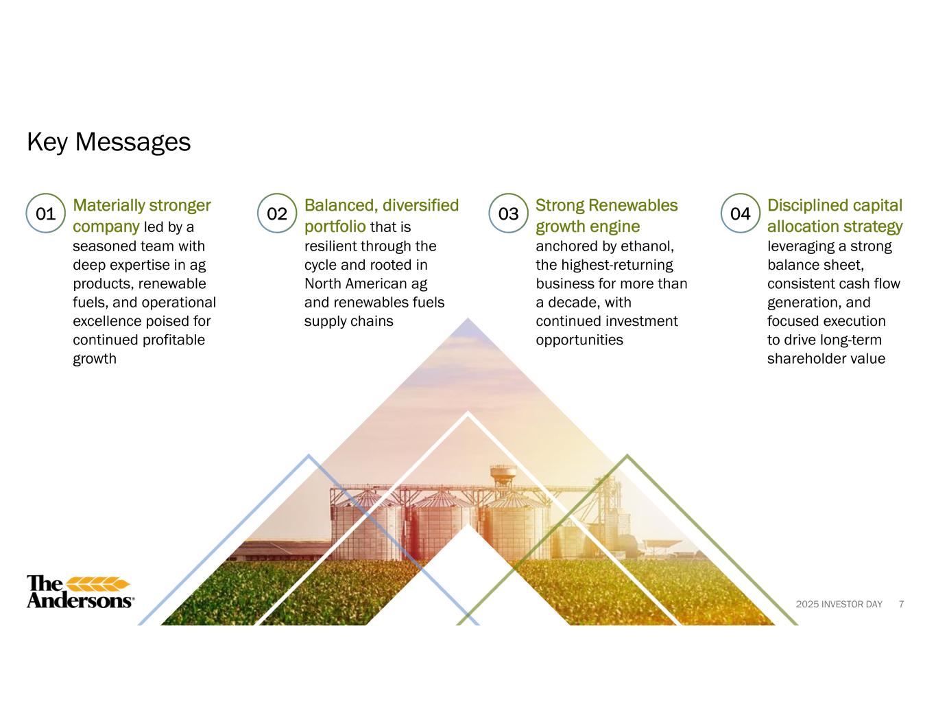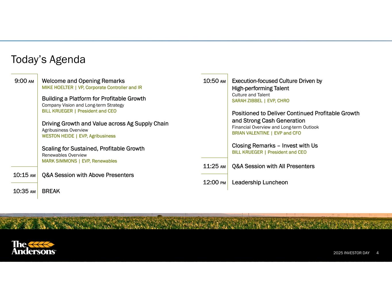 2025 INVESTOR DAY 3 Certain information disclosed constitutes forward-looking statements. Actual results could differ materially from those presented in the forward-looking statements as a result of many factors including general economic, weather, and regulatory conditions, competition, geopolitical risk, and additional factors that are described in the company’s publicly-filed documents, including its ’34 Act filings and the prospectuses prepared in connection with the company’s offerings. This presentation contains non-GAAP financial measures. The company believes that pretax income attributable to the company; adjusted pretax income attributable to the company; adjusted pretax income; adjusted net income attributable to the company; adjusted diluted earnings per share; earnings before interest, taxes, depreciation and amortization (or EBITDA); adjusted EBITDA; and cash from operations before working capital changes provide additional information to investors and others about its operations, allowing an evaluation of underlying operating performance and liquidity and better period-to-period comparability. The above measures are not and should not be considered as alternatives to pretax income or income before income taxes; net income; diluted earnings per share attributable to The Andersons, Inc. common shareholders and cash provided by (used in) operating activities as determined by generally accepted accounting principles. Reconciliations of the GAAP to non-GAAP measures may be found within the financial tables in the appendix. Safe Harbor and Non-GAAP Financial Measures