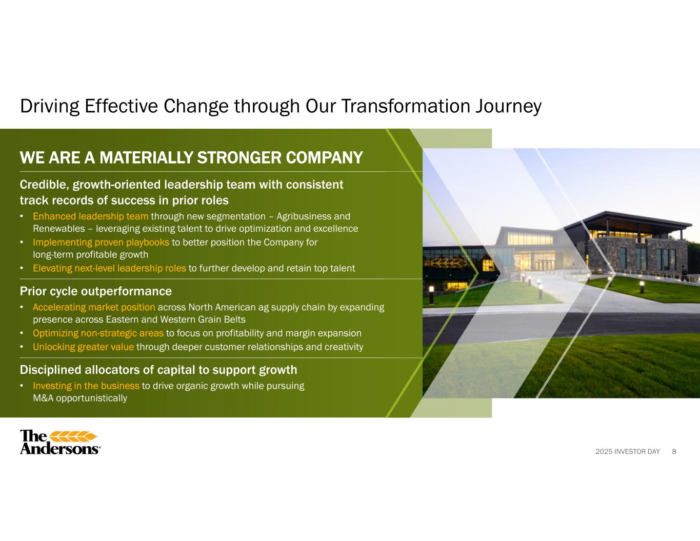 2025 INVESTOR DAY 7 Key Messages Materially stronger company led by a seasoned team with deep expertise in ag products, renewable fuels, and operational excellence poised for continued profitable growth Balanced, diversified portfolio that is resilient through the cycle and rooted in North American ag and renewables fuels supply chains Strong Renewables growth engine anchored by ethanol, the highest-returning business for more than a decade, with continued investment opportunities Disciplined capital allocation strategy leveraging a strong balance sheet, consistent cash flow generation, and focused execution to drive long-term shareholder value 01 02 03 04