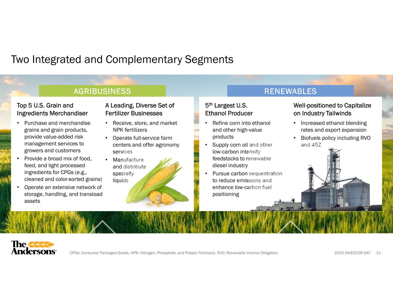 2025 INVESTOR DAY 10 1 All data is Trailing Twelve Months ended 9/30/2025. 2 Inclusive of Skyland employees. 3 As of 9/30/2025. 4 Non-GAAP financial measure; see appendix for reconciliations. 5 Excludes the impact of the “Other” segment. A Leading, Nimble North American Ag and Renewable Fuels Company The Andersons Snapshot (NASDAQ: ANDE) 1947Founded Maumee, OHHeadquarters 2,600Total Employees2 ~180Locations $1.4BMarket Cap3 $11.6BRevenue $317MAdjusted EBITDA4 $2.56Adjusted EPS4 KEY STATS1 SUSTAINABLE COMPETITIVE ADVANTAGES Driving Organizational Alignment to Unlock Value, Better Serve Customers, and Drive Growth Broad geographic footprint with extensive reach close to producers and customers Integral to North American ag and renewable fuels supply chain connecting production to demand Proven leadership team focused on driving execution and accountability Deep relationships and unmatched customer service 47% 53% ADJ. EBITDA1,4,5 BY SEGMENT RENEWABLES AGRIBUSINESS