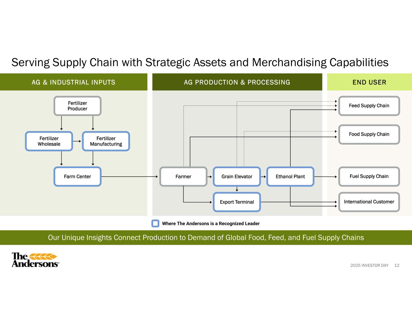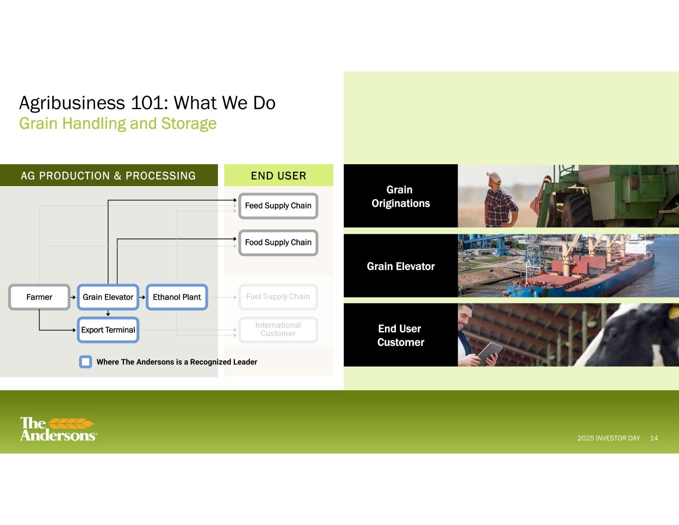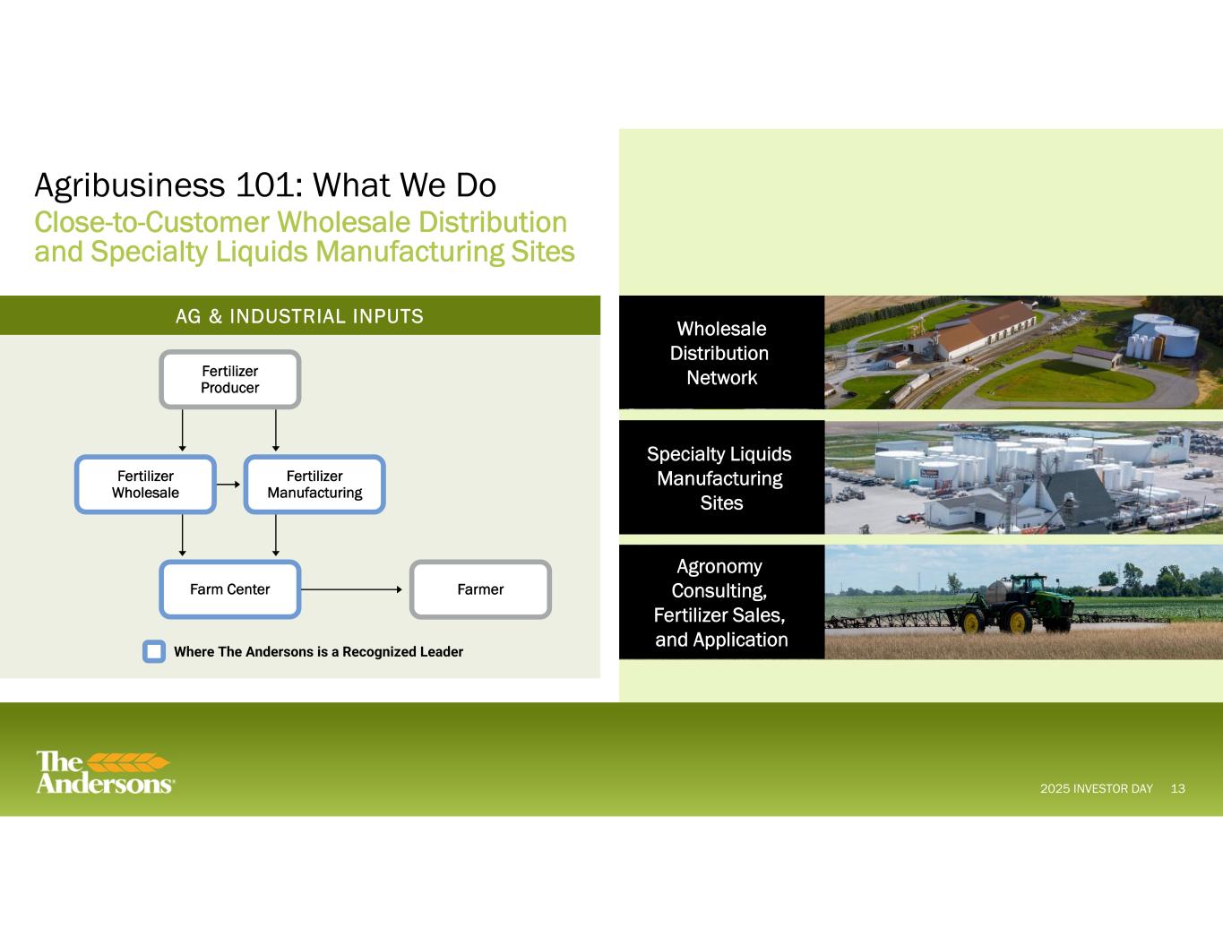 2025 INVESTOR DAY Agribusiness 101: What We Do Close-to-Customer Wholesale Distribution and Specialty Liquids Manufacturing Sites 13 Specialty Liquids Manufacturing Sites Wholesale Distribution Network AG & INDUSTRIAL INPUTS Farm Center Farmer Fertilizer Producer Fertilizer Wholesale Fertilizer Manufacturing Where The Andersons is a Recognized Leader Agronomy Consulting, Fertilizer Sales, and Application