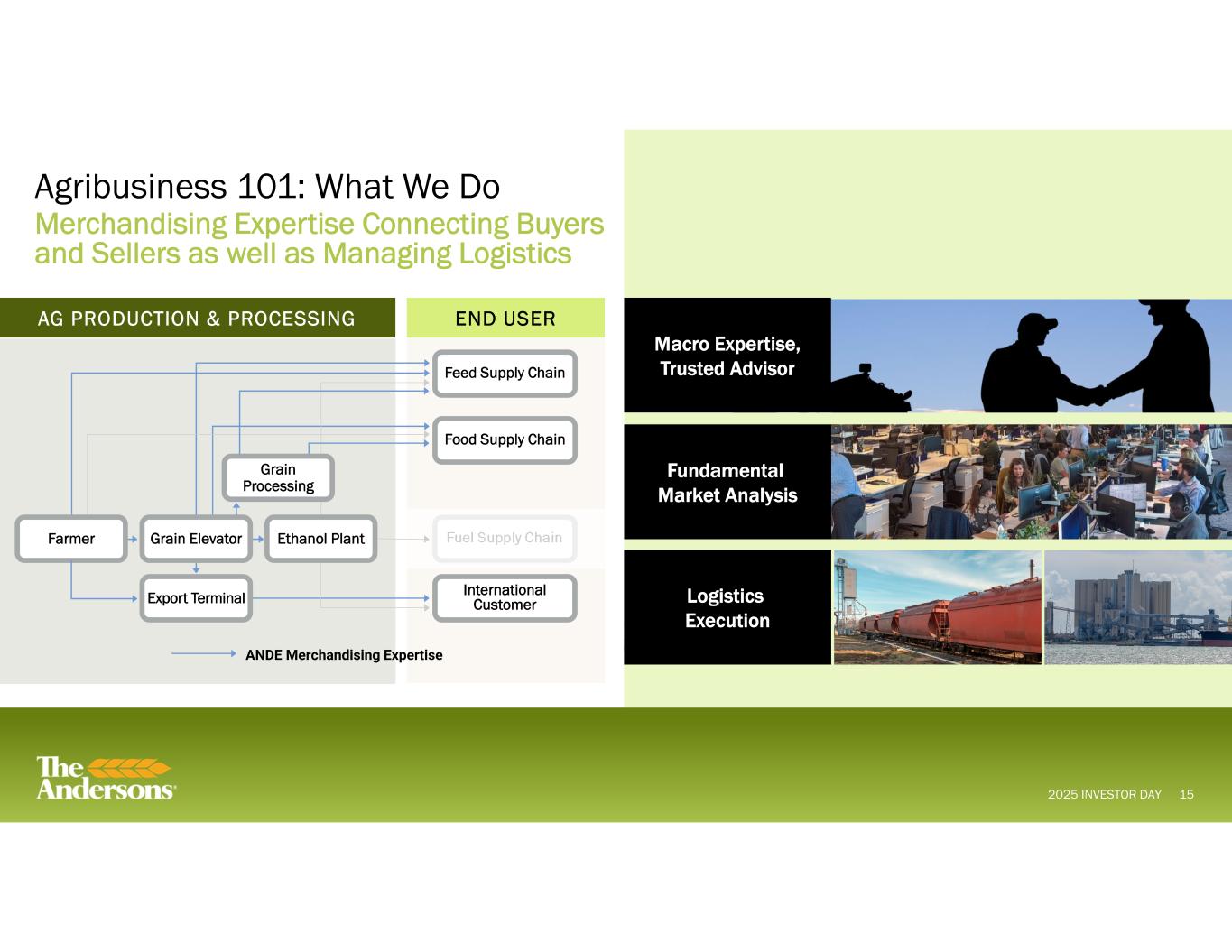 2025 INVESTOR DAY Grain Handling and Storage 14 Agribusiness 101: What We Do End User Customer Grain Originations Grain Elevator Fuel Supply Chain International Customer Food Supply Chain Feed Supply Chain AG PRODUCTION & PROCESSING END USER Export Terminal Grain Elevator Ethanol PlantFarmer Where The Andersons is a Recognized Leader