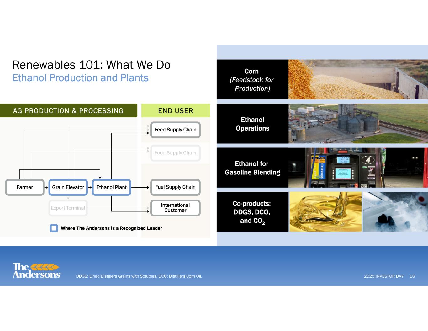 2025 INVESTOR DAY Agribusiness 101: What We Do Merchandising Expertise Connecting Buyers and Sellers as well as Managing Logistics 15 Logistics Execution Macro Expertise, Trusted Advisor Fundamental Market Analysis Fuel Supply Chain International Customer Food Supply Chain Feed Supply Chain AG PRODUCTION & PROCESSING END USER Export Terminal Grain Elevator Ethanol PlantFarmer Grain Processing ANDE Merchandising Expertise