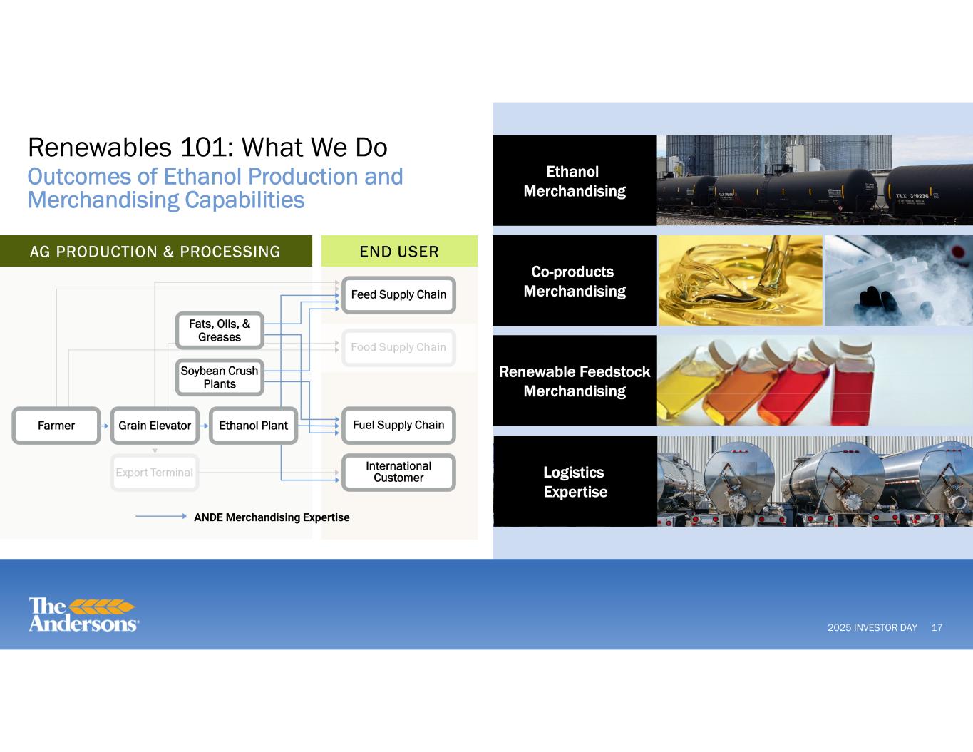 2025 INVESTOR DAY 16 Renewables 101: What We Do Ethanol Production and Plants Corn (Feedstock for Production) Ethanol Operations Ethanol for Gasoline Blending Co-products: DDGS, DCO, and CO2 Export Terminal Food Supply Chain Fuel Supply Chain International Customer Feed Supply Chain AG PRODUCTION & PROCESSING END USER Grain Elevator Ethanol PlantFarmer Where The Andersons is a Recognized Leader DDGS: Dried Distillers Grains with Solubles. DCO: Distillers Corn Oil.