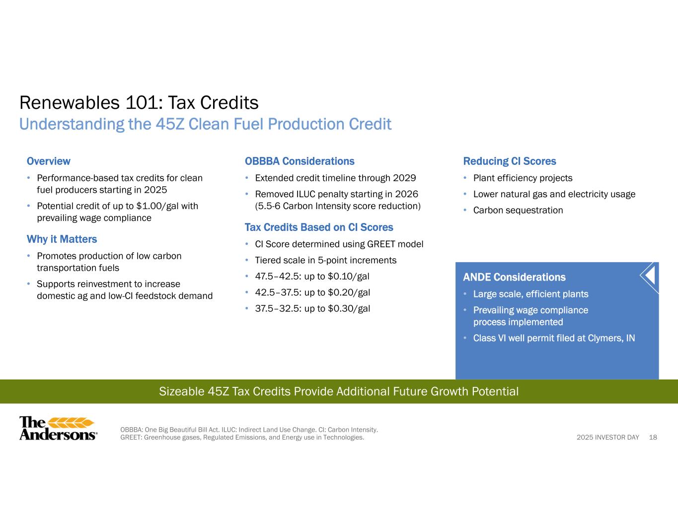 2025 INVESTOR DAY 18 Renewables 101: Tax Credits Understanding the 45Z Clean Fuel Production Credit Sizeable 45Z Tax Credits Provide Additional Future Growth Potential Overview • Performance-based tax credits for clean fuel producers starting in 2025 • Potential credit of up to $1.00/gal with prevailing wage compliance Why it Matters • Promotes production of low carbon transportation fuels • Supports reinvestment to increase domestic ag and low-CI feedstock demand OBBBA Considerations • Extended credit timeline through 2029 • Removed ILUC penalty starting in 2026 (5.5-6 Carbon Intensity score reduction) Tax Credits Based on CI Scores • CI Score determined using GREET model • Tiered scale in 5-point increments • 47.5–42.5: up to $0.10/gal • 42.5–37.5: up to $0.20/gal • 37.5–32.5: up to $0.30/gal Reducing CI Scores • Plant efficiency projects • Lower natural gas and electricity usage • Carbon sequestration ANDE Considerations • Large scale, efficient plants • Prevailing wage compliance process implemented • Class VI well permit filed at Clymers, IN OBBBA: One Big Beautiful Bill Act. ILUC: Indirect Land Use Change. CI: Carbon Intensity. GREET: Greenhouse gases, Regulated Emissions, and Energy use in Technologies.