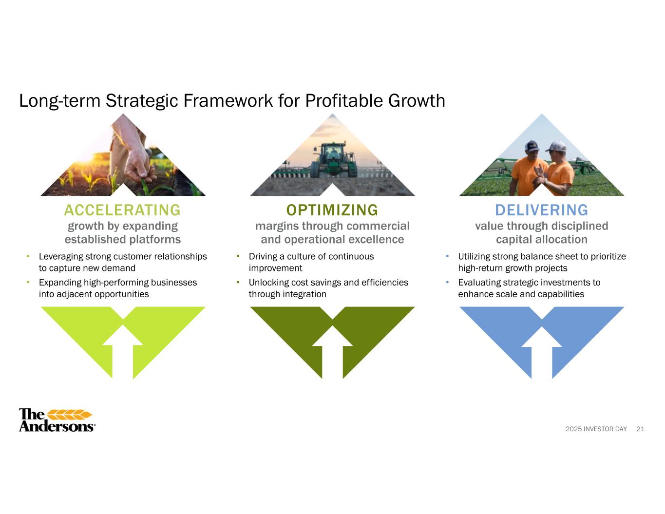 2025 INVESTOR DAY 20 Well-positioned for Favorable Macro Trends Bi-partisan policy support continues to reinforce long-term positive momentum in energy and agriculture markets Resilient and Flexible Supply Chains Create Sizeable Opportunities within Agribusiness and Renewables Increased ethanol blending rates and export expansion Biofuels policy including RVO and 45Z Increased emphasis on domestic Ag consumption Excess soybean meal supply with increased crush capacity Evolving consumer and stakeholder requirements